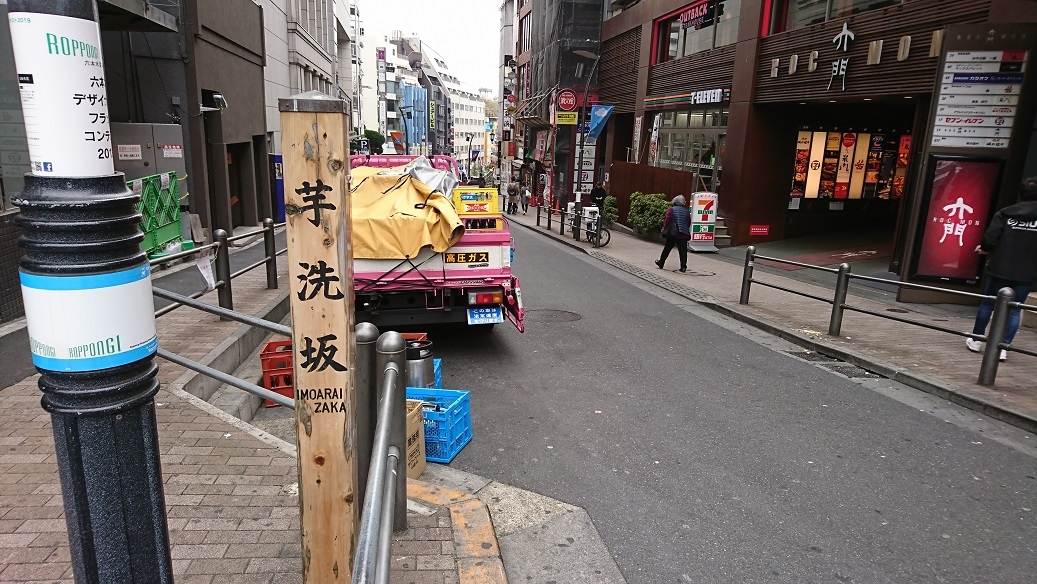 六本木駅からすぐ、六本木通りのアマンド前から麻布十番方面へ下っていく坂道が芋洗坂です。坂の途中にある朝日神社の前で芋が売られていたことから芋洗坂と呼ばれるようになったという説が有力ですが、名前の由来は諸説あるそうです。比較的急勾配の坂道で、上りはかなりきついです。