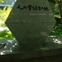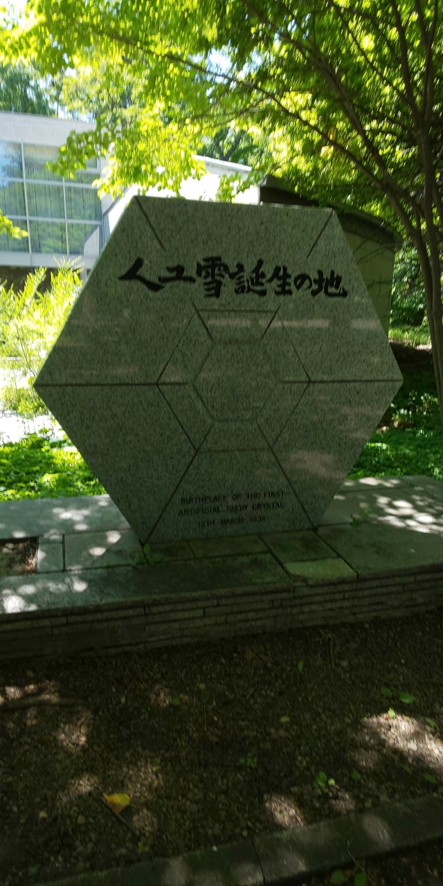 北海道大学のキャンパス内を散策してると様々な石碑や像がありますが、こちらは人工雪がはじめてつくられたことを記念する発祥の碑です。