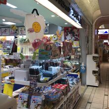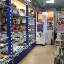 店内入ると左側の棚には靴下、Tシャツ等が置いてあり上を見ると額縁がいくつか置いてありました。大きな商品よりコルクコースターやキーホルダー等の小物が多数あり、テレビで良く見かけるアニメのキャラクター商品がありました。