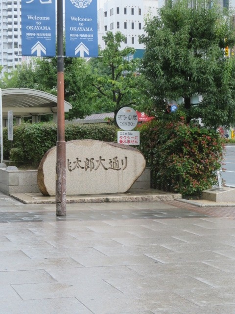 JRの岡山駅が桃太郎大通りのスタート地点になります。JRの岡山駅には桃太郎像があるので、ここがスタートと考えられますね。この大通りには、路面電車も路線バスもタクシーも走っていて、岡山市の目抜き通りですね。観光色はないですね。