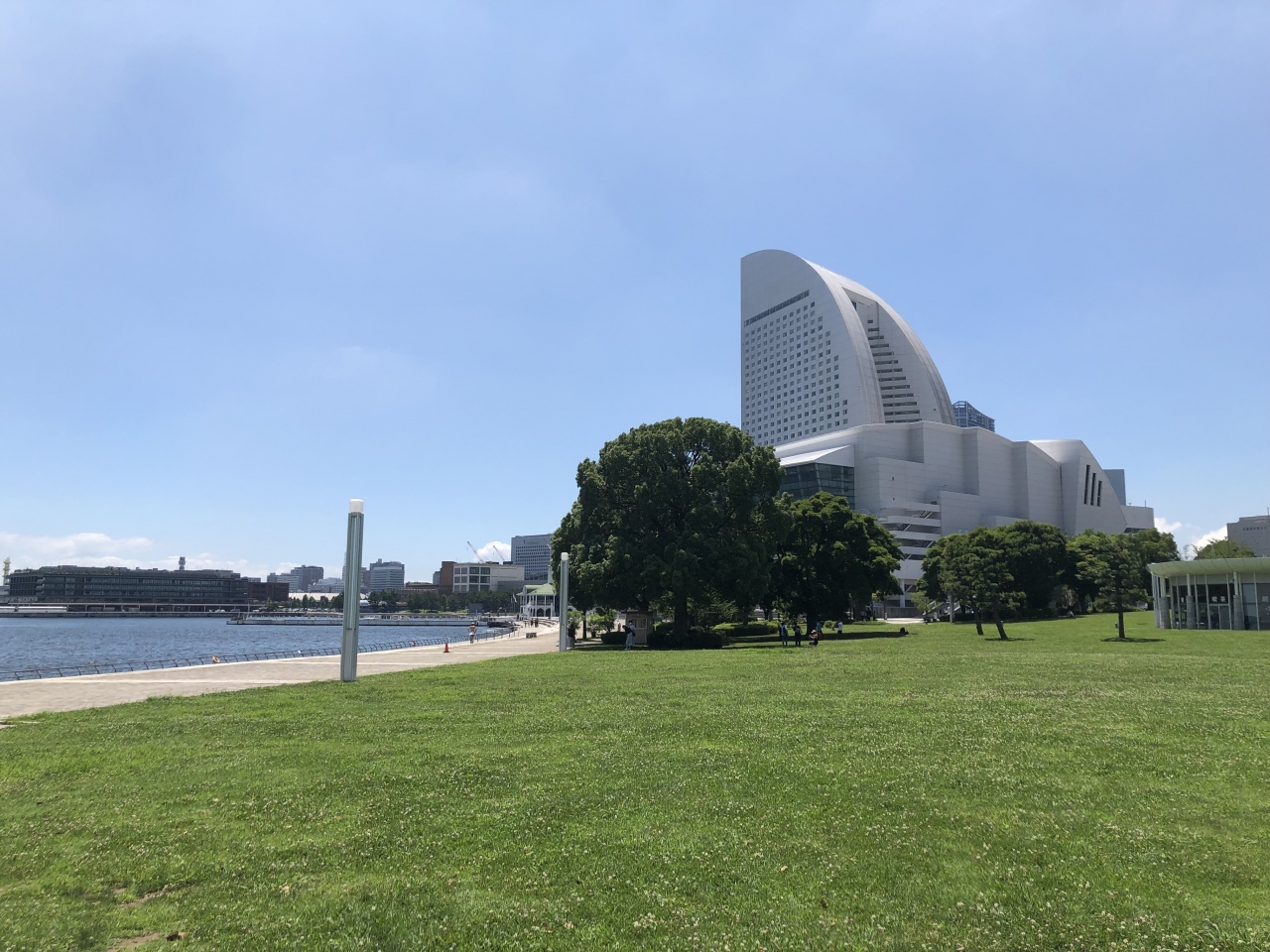 桜木町駅やみなとみらい駅から行くと、パシフィコ横浜の奥、横浜港に面して広がる芝生がきれいな公園です。みなとみらい地区にあって、アクセスしにくい場所にあるので、他のエリアに比べて人が少ない、穴場的な公園です。