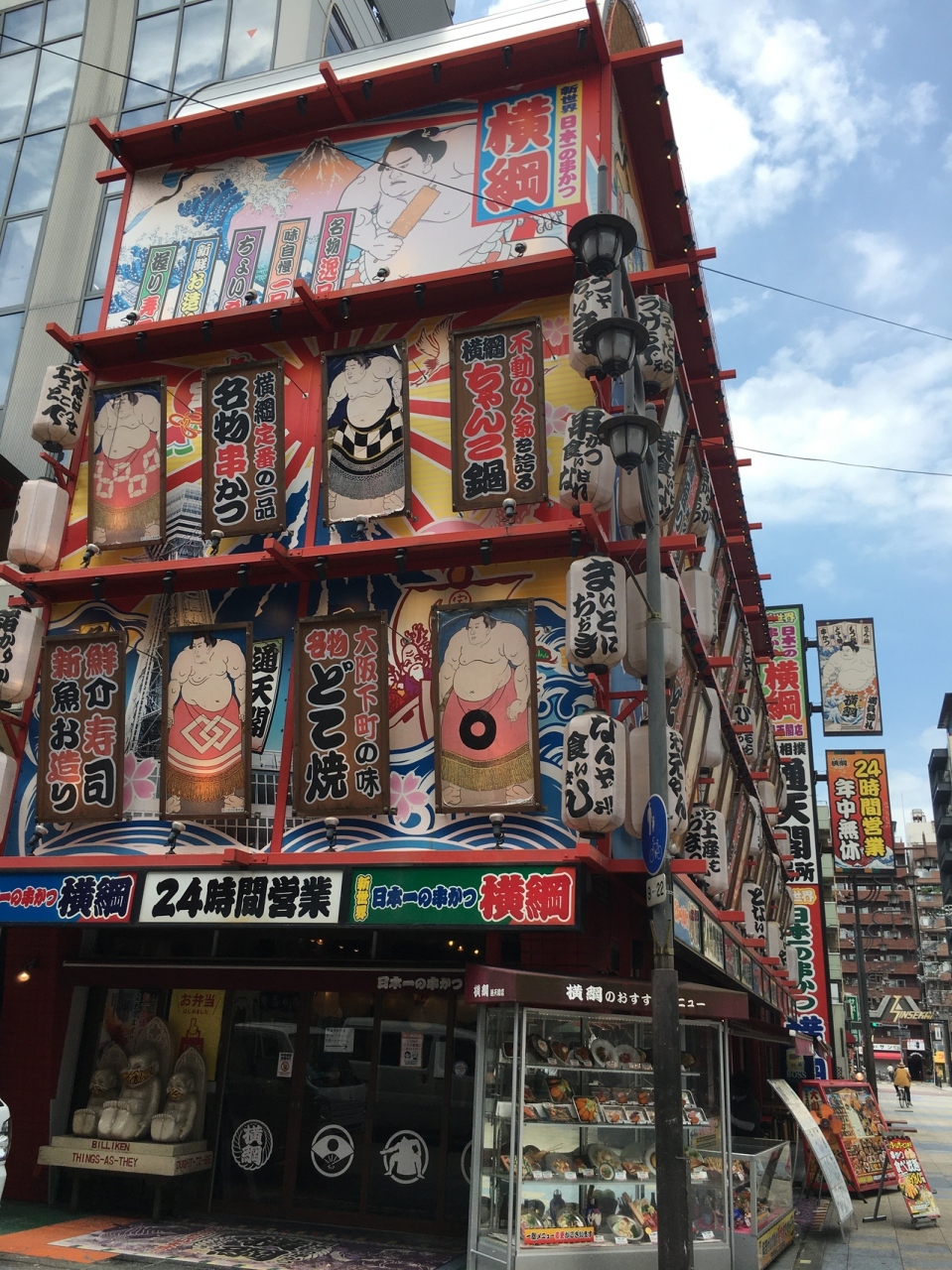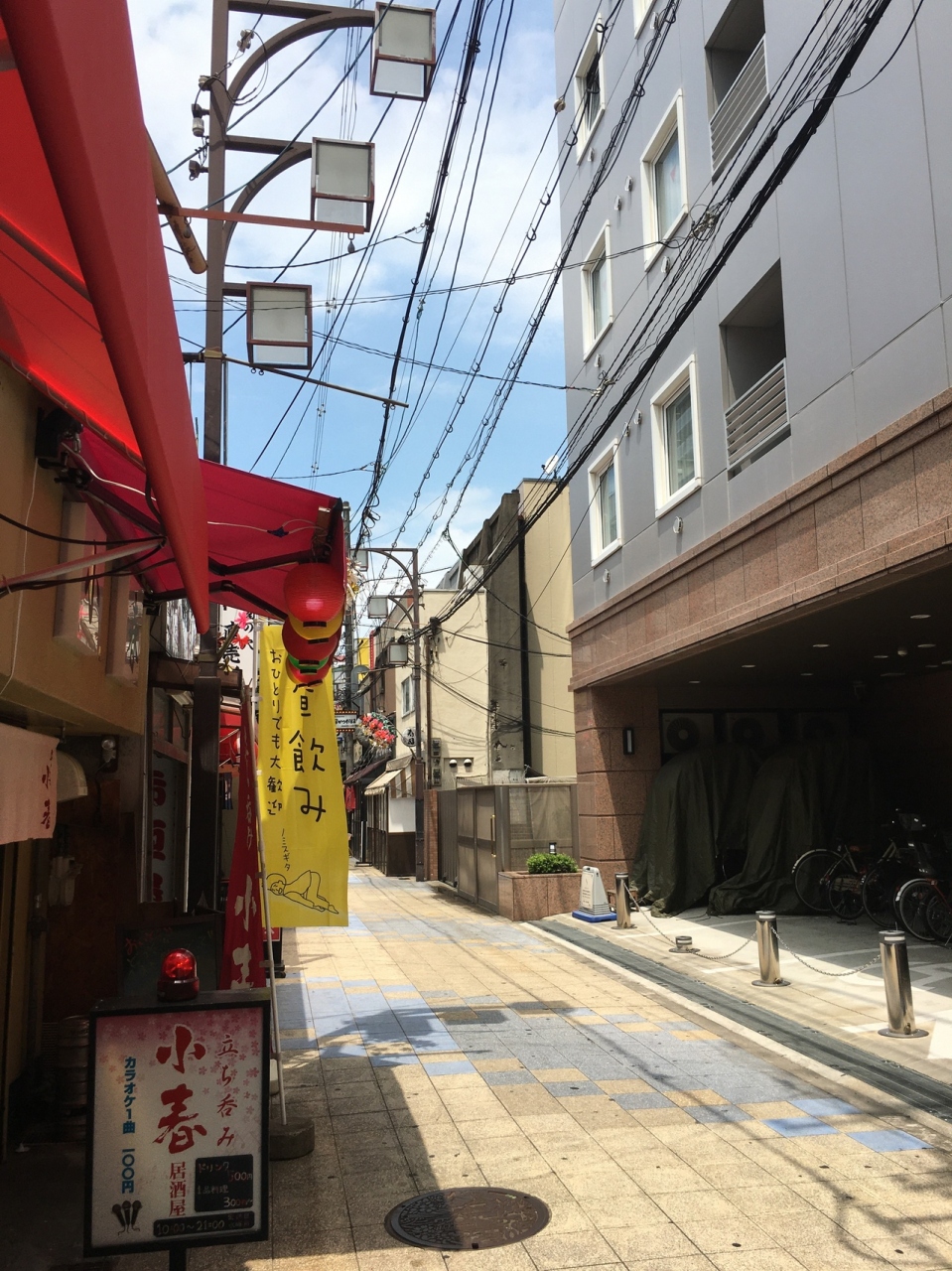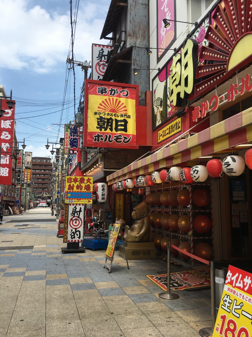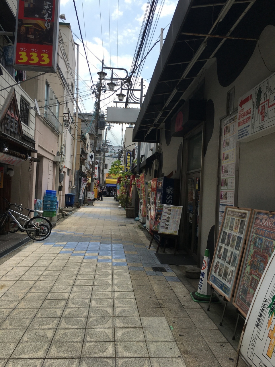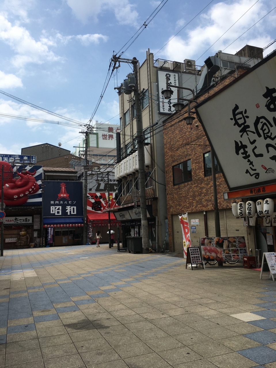 通天閣周辺の場所で、串カツ屋がやたら目立ちましたが、飲み屋や遊戯場等もあります。ミニテーマパークのような通りにはド派手な看板が立ち並び歩くだけでも雰囲気が良い場所でした。薄暗い通りの市場や神社も実物です。