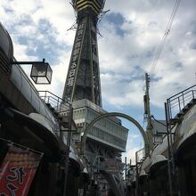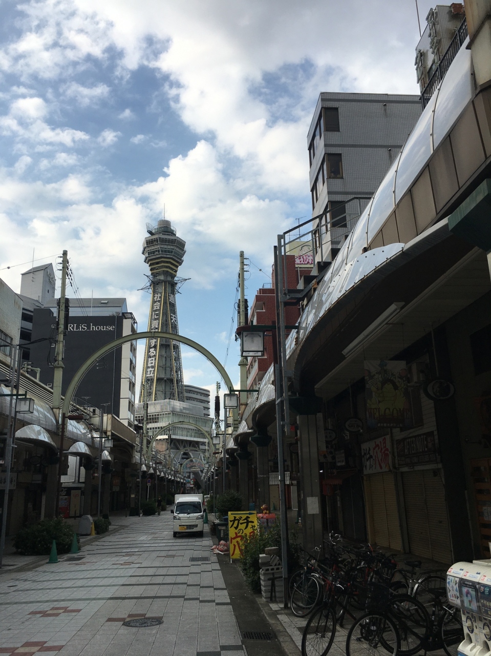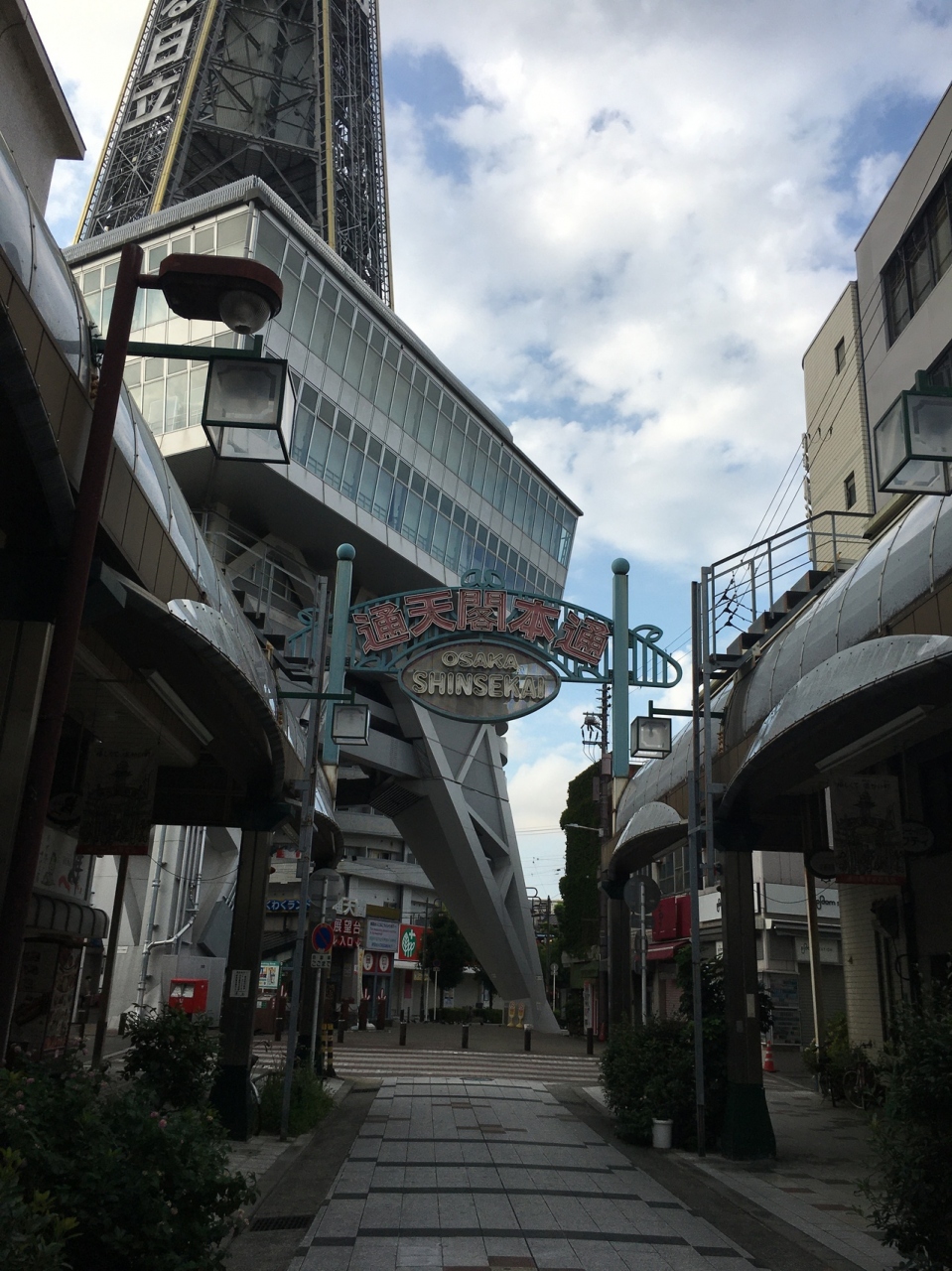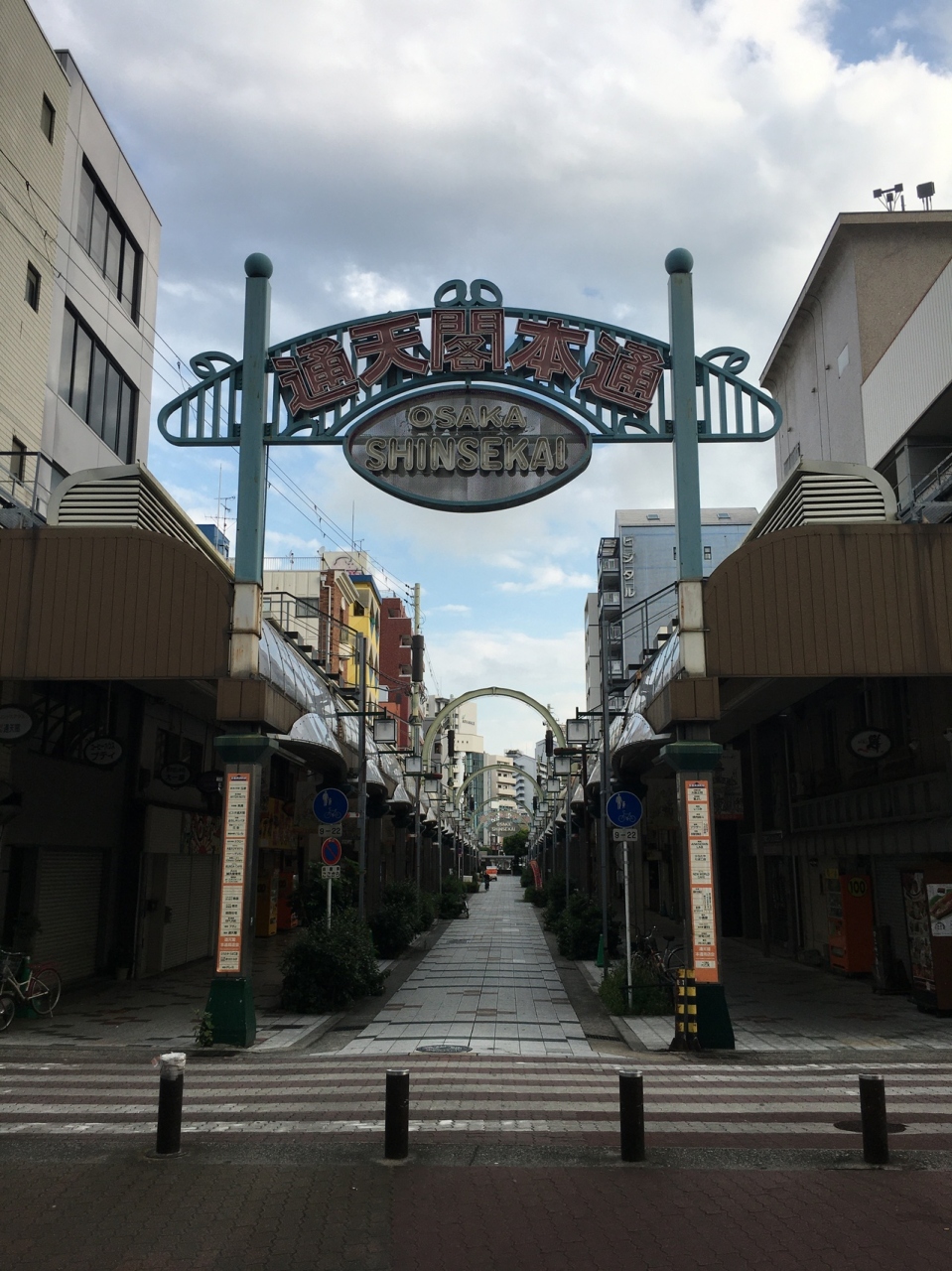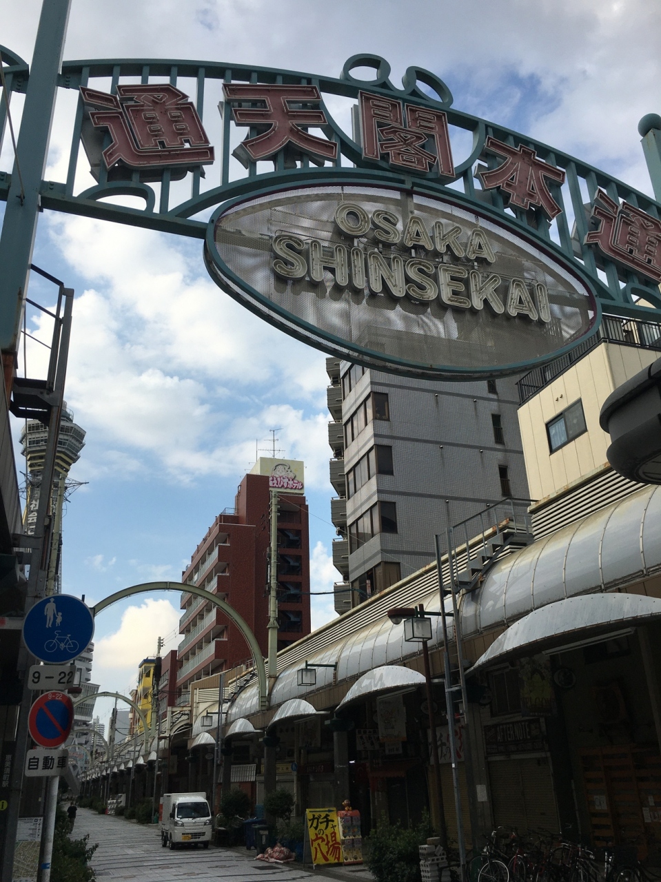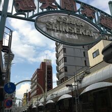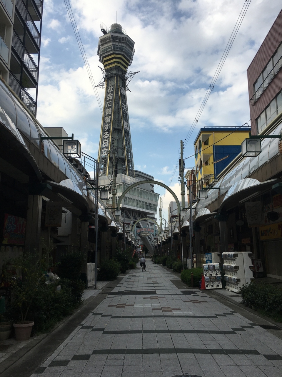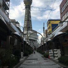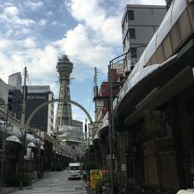 恵美須駅降りたら商店街が連なっていて、正面には通天閣が見えました。通天閣までゆっくり歩いても徒歩5分もあれば着きます。ゆったりとした広さで、左右には店が連なっていますが、ごちゃごちゃ感はないです。昔ながらの市場もあります。