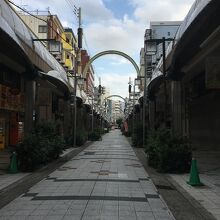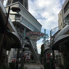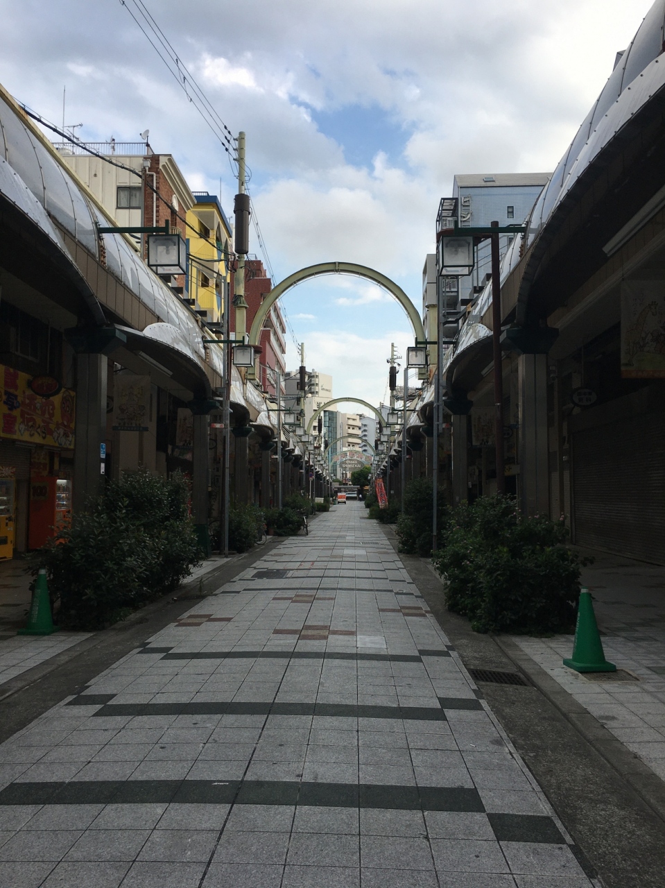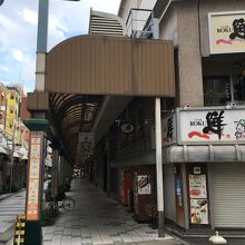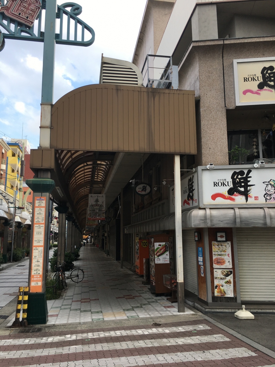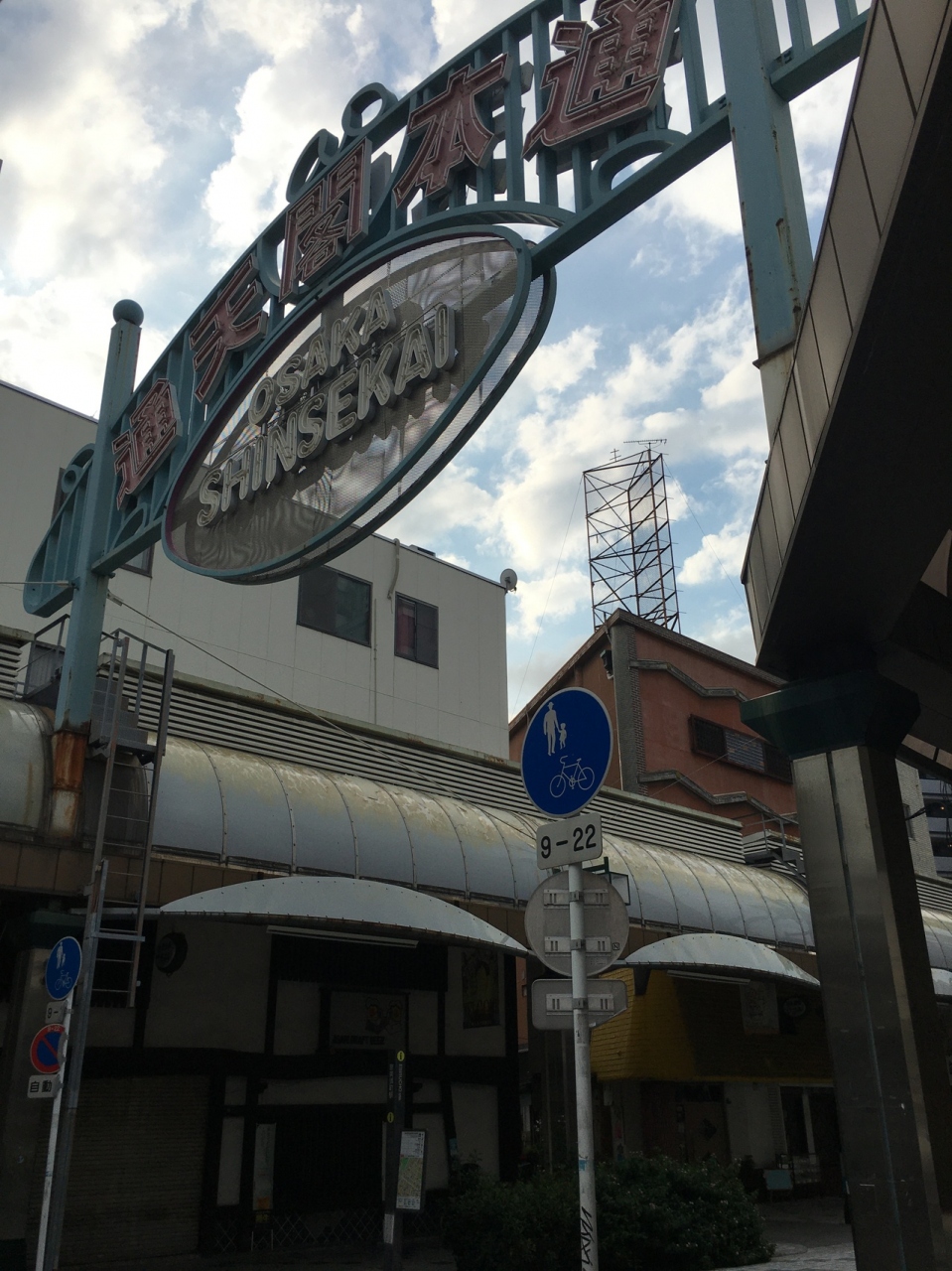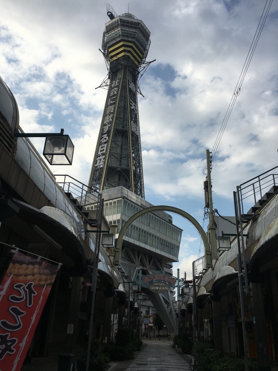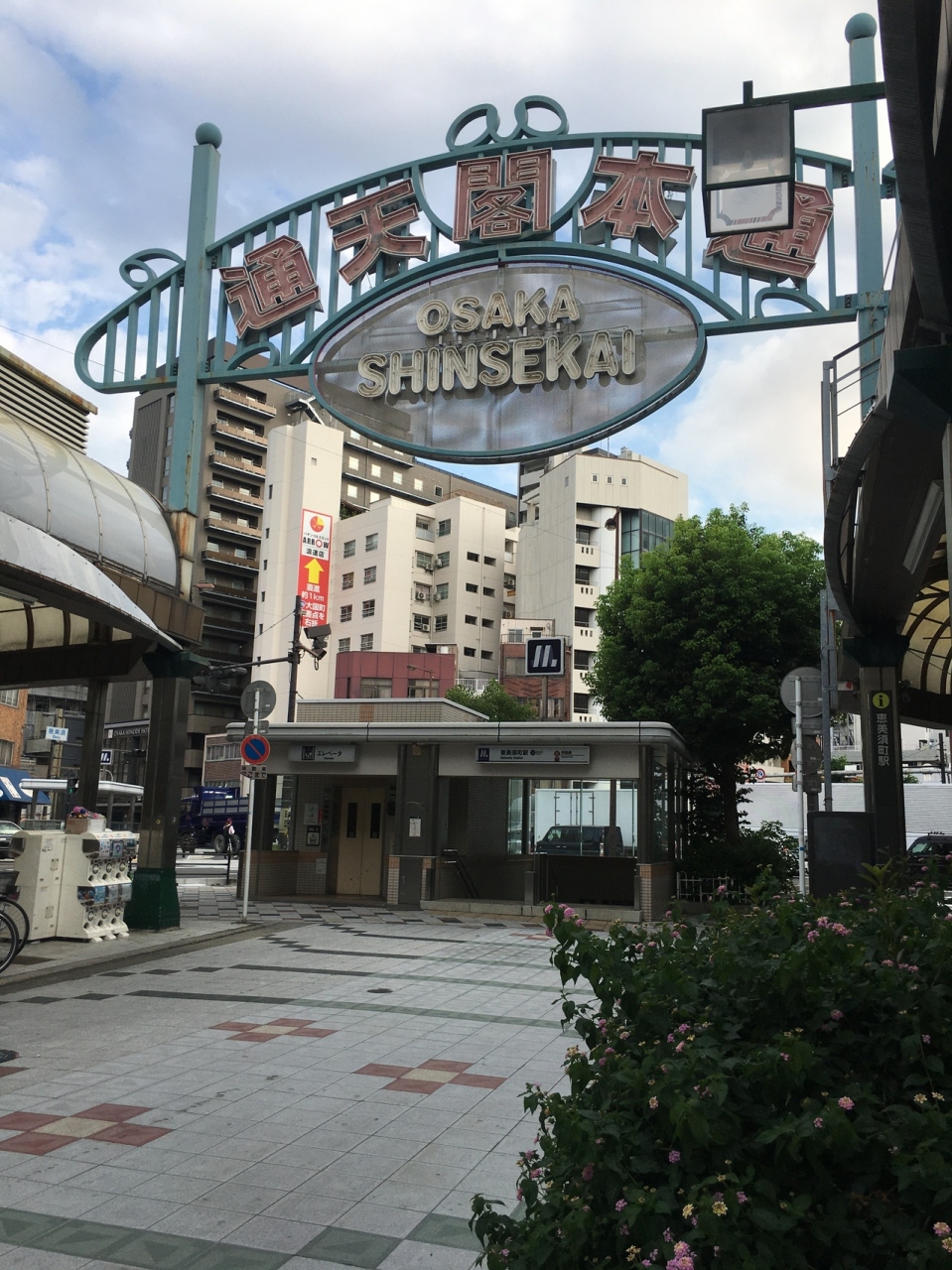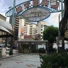 恵美須駅降りたら商店街が連なっていて、正面には通天閣が見えました。通天閣までゆっくり歩いても徒歩5分もあれば着きます。ゆったりとした広さで、左右には店が連なっていますが、ごちゃごちゃ感はないです。昔ながらの市場もあります。
