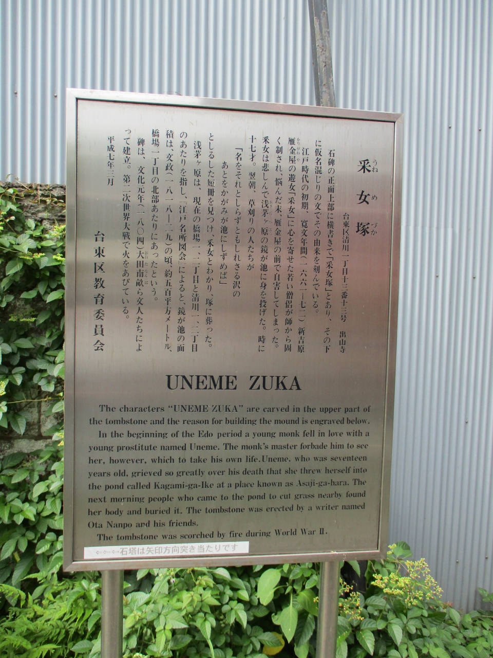 浅草に近い清川近辺を散策していて、真っ赤に目立つお寺があったので立ち寄りました。境内に入ると現在整備中なのか、雰囲気が雑然としていました。采女塚という吉原の遊女の石碑が建てられていましたが、案内板とともに庭の中に取り残されているようでした。