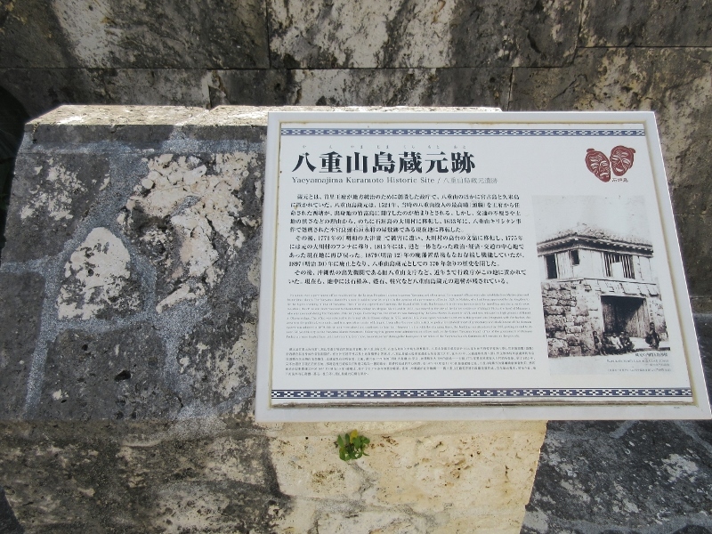 琉球政府が地方統治のために設置した役場の跡とのことですが、石塀の他に標識があるだけでした。すぐ隣に八重山博物館が建っているので、同じ敷地だったのであろうと思いました。標識に蔵元の写真があったので、こんな感じだったのかと思いました。