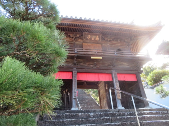 岡山県の重要文化財です。こちらの薬師堂は、1624年の建築で、勾配のきつい大屋根が特徴です。あとこちらは「男はつらいよ」のロケ地です。山門を入ると、水かけお大師さまががいるので、まずこちらでお願いごとをしましょう。あと、こちらのお寺は高台にあるので街が一望のもとで癒しの風景です。