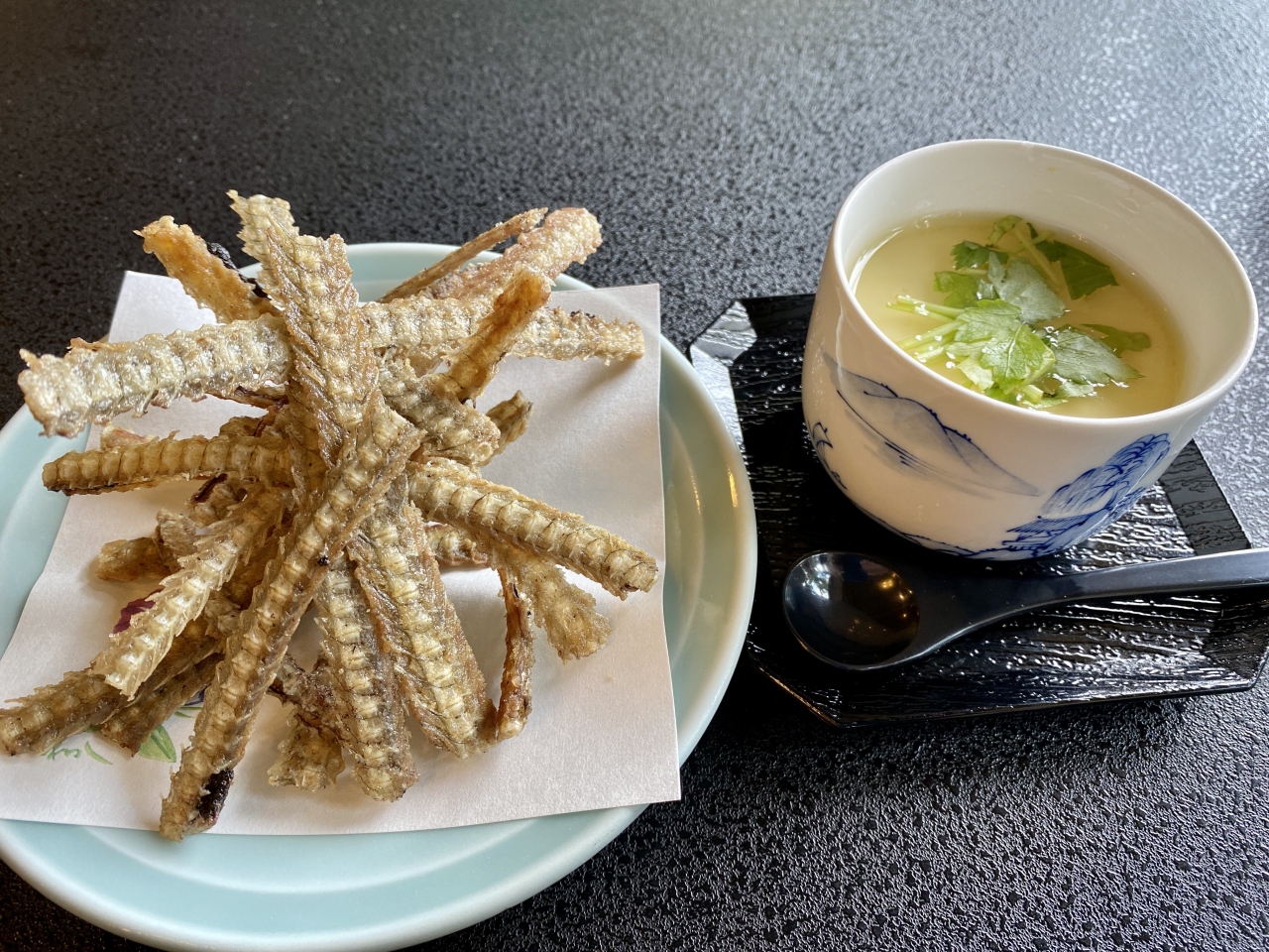 まずは、鰻の骨せんべい。塩味が効いてカリカリ美味しいです。