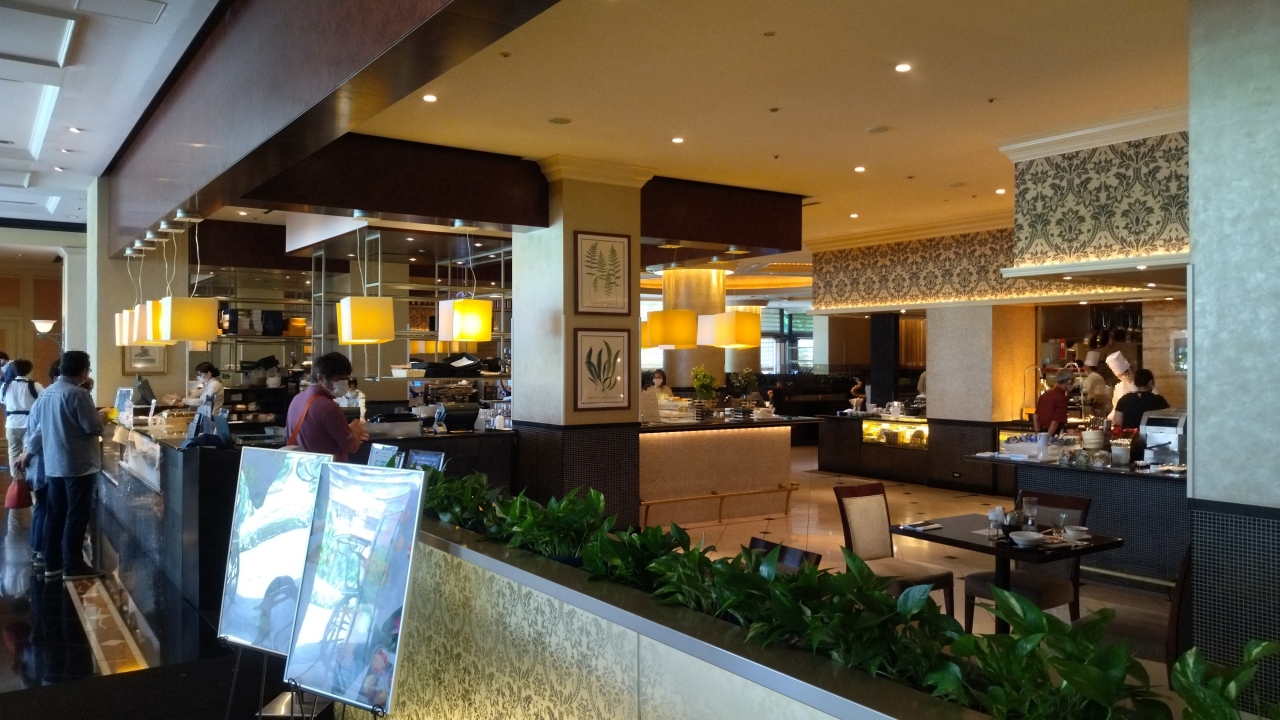 明るく広々としたホールでは、オープンキッチンから生み出されるバラエティ豊かな料理や、ペストリーシェフによる人気のスイーツを楽しむことができます。