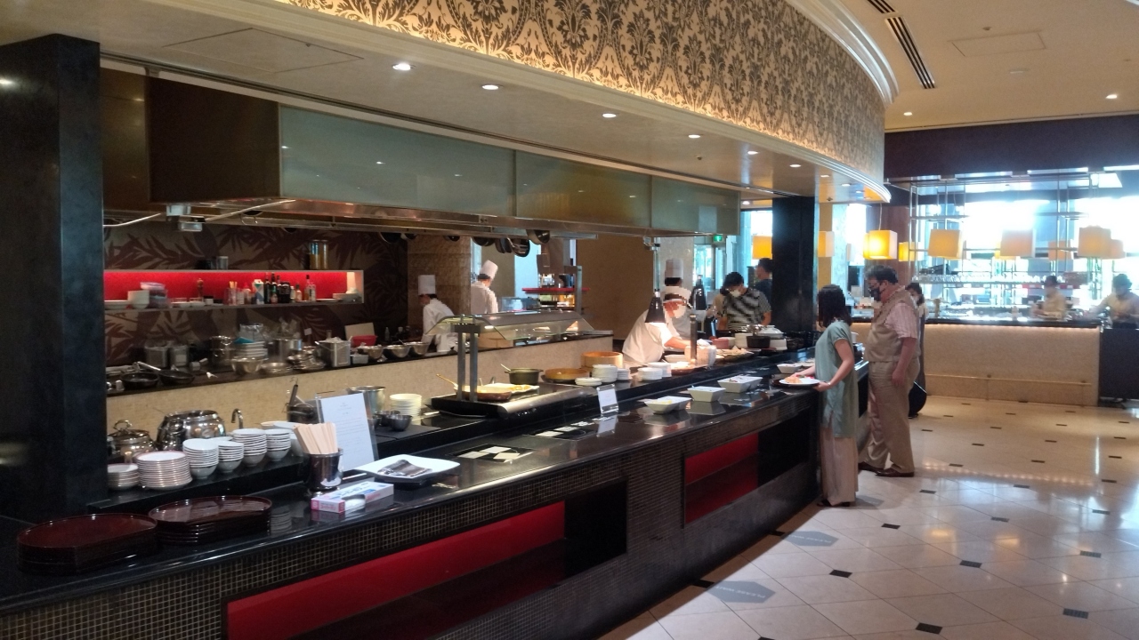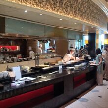ライブ感のオープンキッチンと開放的な雰囲気の中でのインターナショナルブッフェ