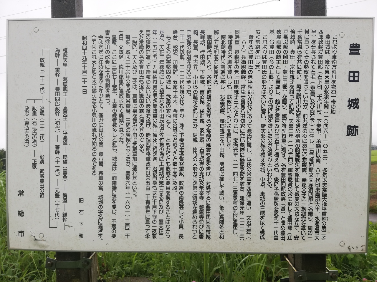 豊田城「地域交流センター」は、遠くからでもよくとわかる天守閣、 旧石下町 現在は常総市のシンボル的なタワーとなっている。 元々 ここにあったわけではなく もう少し東へ数km行った小見川沿いにあった。 本日はコロナウイルス蔓延防止に当県も 対象となってしまったため 残念ながら休館であった。 しかし 実際に豊田城があったところには このような碑も立てられ、 往時の隆盛を偲んでいる。碑のあるこの場所も 堤防造成のために 城の遺構も全て解体されてしまっている。