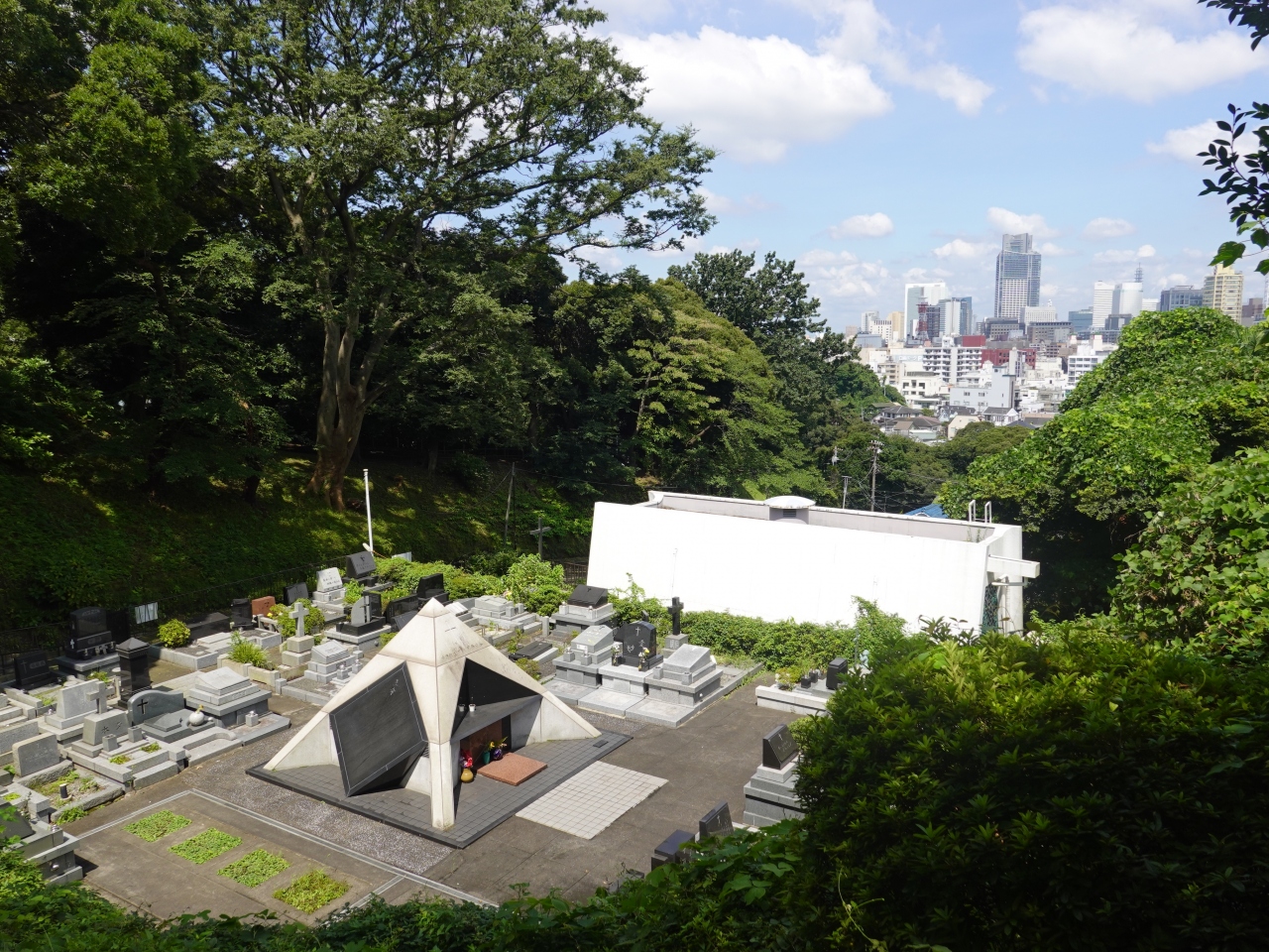 「横浜外国人墓地」は、港の見える丘公園の西側、山手町の斜面にある大きな墓地です。訪れたのが梅雨明け直後の夏空が広がる晴天の日で、外国人墓地の周囲の緑が色濃く茂り、遠方には高層ビルが聳えるという、とても印象的な光景を見ることが出来ました。