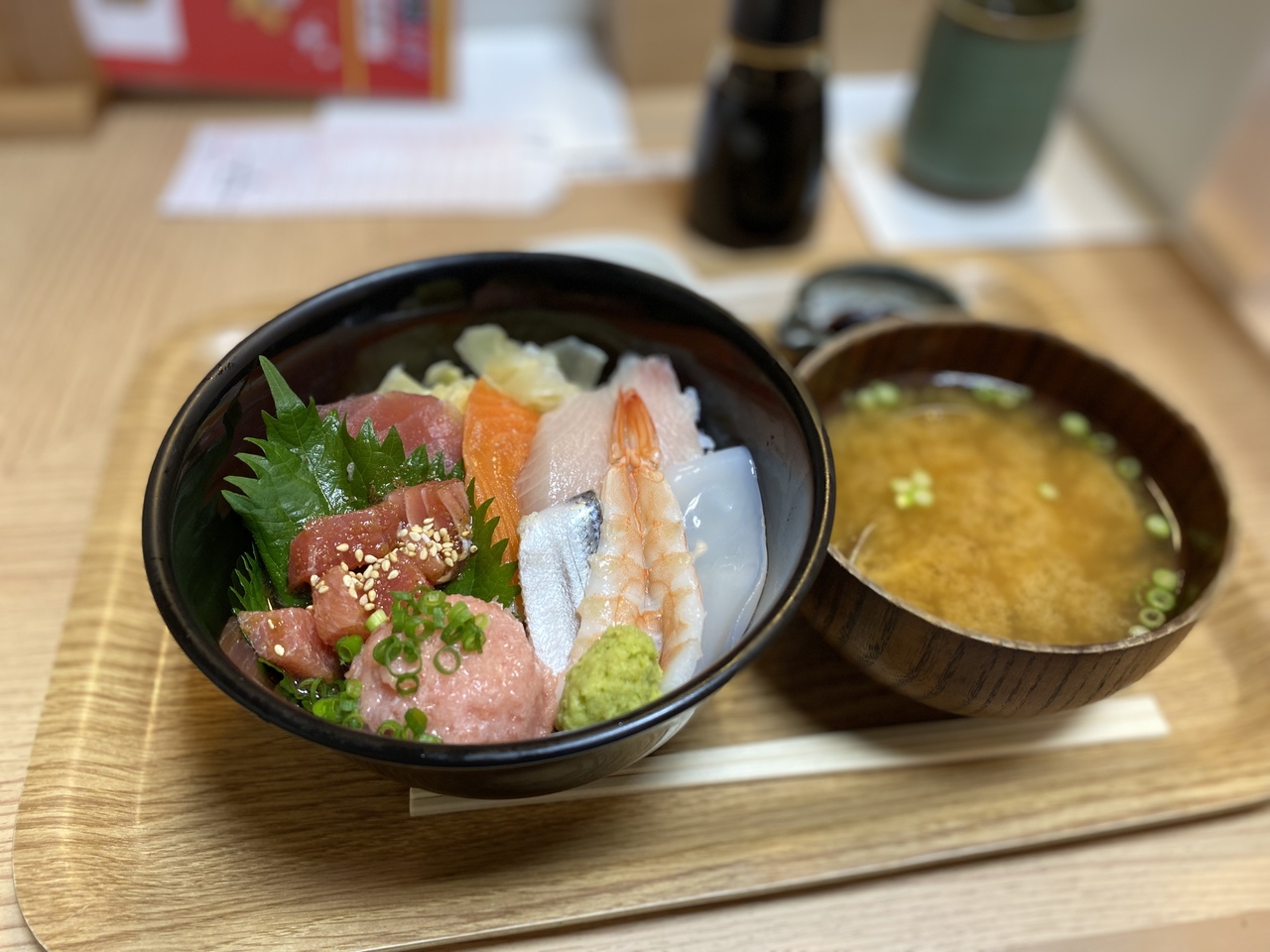 銀座一丁目駅近くにある海鮮丼のお店です。このご時世でやっているお店が少ない中で、長期出張の最中に助かりました。清潔な店内で、広義でザギンでシースーです笑 盛り合わせを食べました。ネタはどれも及第点。お味噌汁が付くのが嬉しいですね。