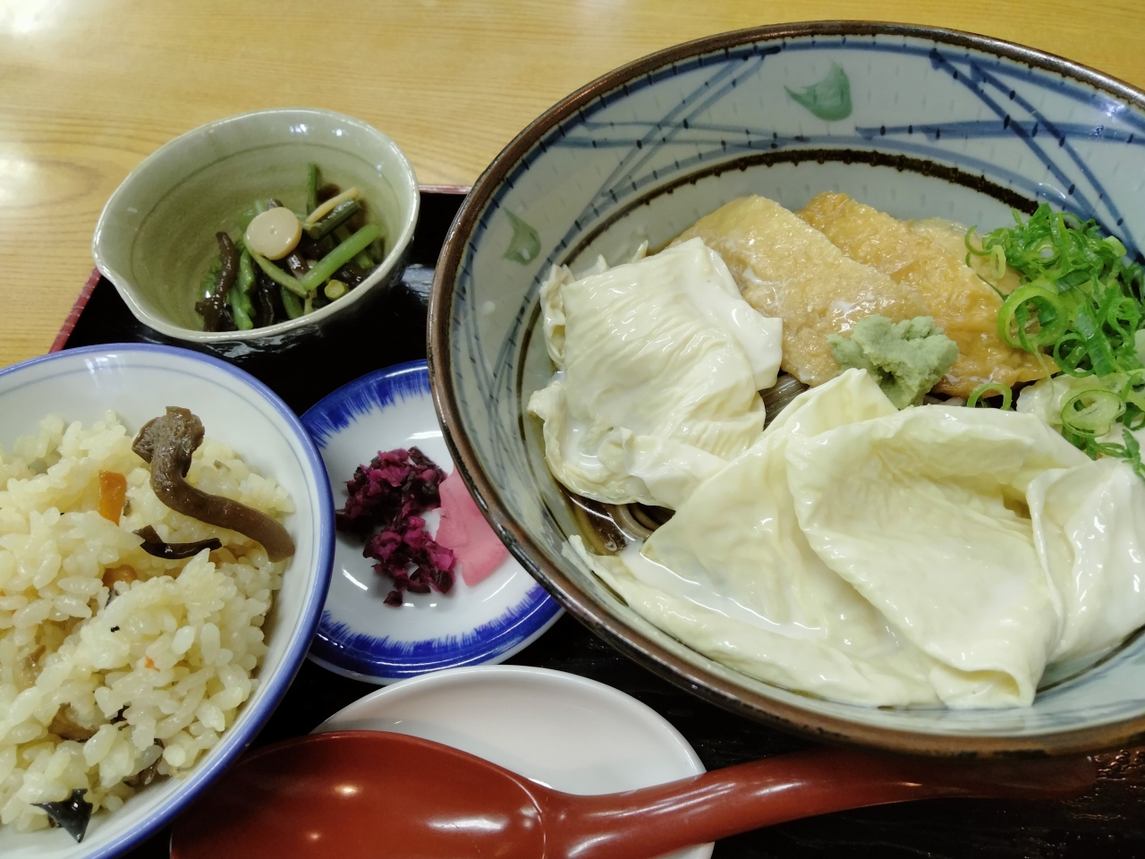 3つの湯葉が入った冷たい湯葉そば、小皿2品、かやくご飯(炊き込みご飯)のサービス定食をいただきました。