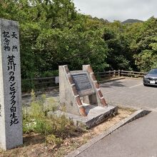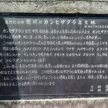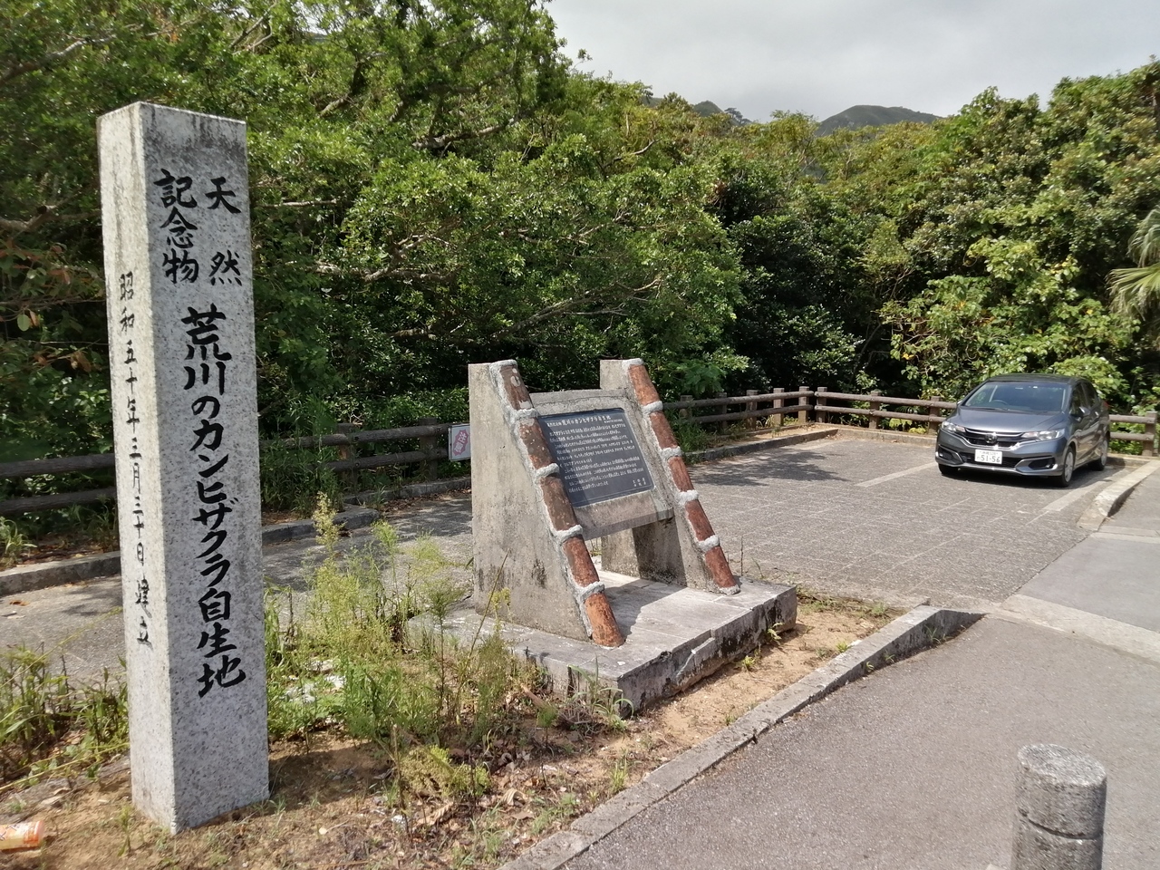 米原ビーチの西方約1km。荒川という川にかかる小さな橋のたもとに「荒川のカンヒザクラ自生地」と書かれた碑があります(駐車場あり)。