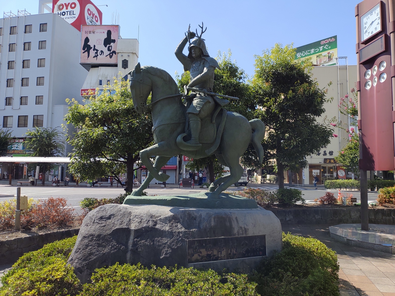 新幹線でも上田電鉄でもしなの鉄道で行っても、車で行っても、上田駅の駅前広場の左にあり、見つけられます。馬にまたがって、堂々とした真田幸村さんの雄姿に、しばし心を奪われました。真夏の青空の下、凛々しい姿の銅像は輝いていました。