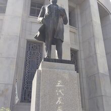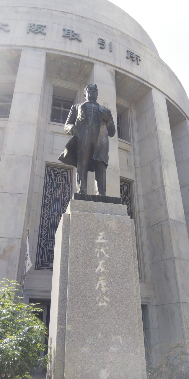 五代友厚像は大阪には商工会議所前とここの証券取引所前の2ヶ所が有名です。台座も含めてなかなか大きな像です。五代友厚は江戸時代末期頃から明治時代の薩摩出身のヒトで、大阪取引所や大阪商工会議所を設立したヒトです。