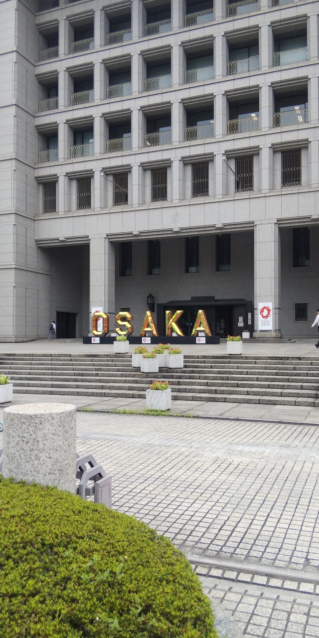大阪市役所は中之島の日本銀行大阪支店の御堂筋を挟んで向かい側にあります。西側の正面口には金文字の「OSAKA」の文字が設置してあります。なかなか大きな文字ですよ。最寄りの駅は大阪メトロの淀屋橋駅だと思います。