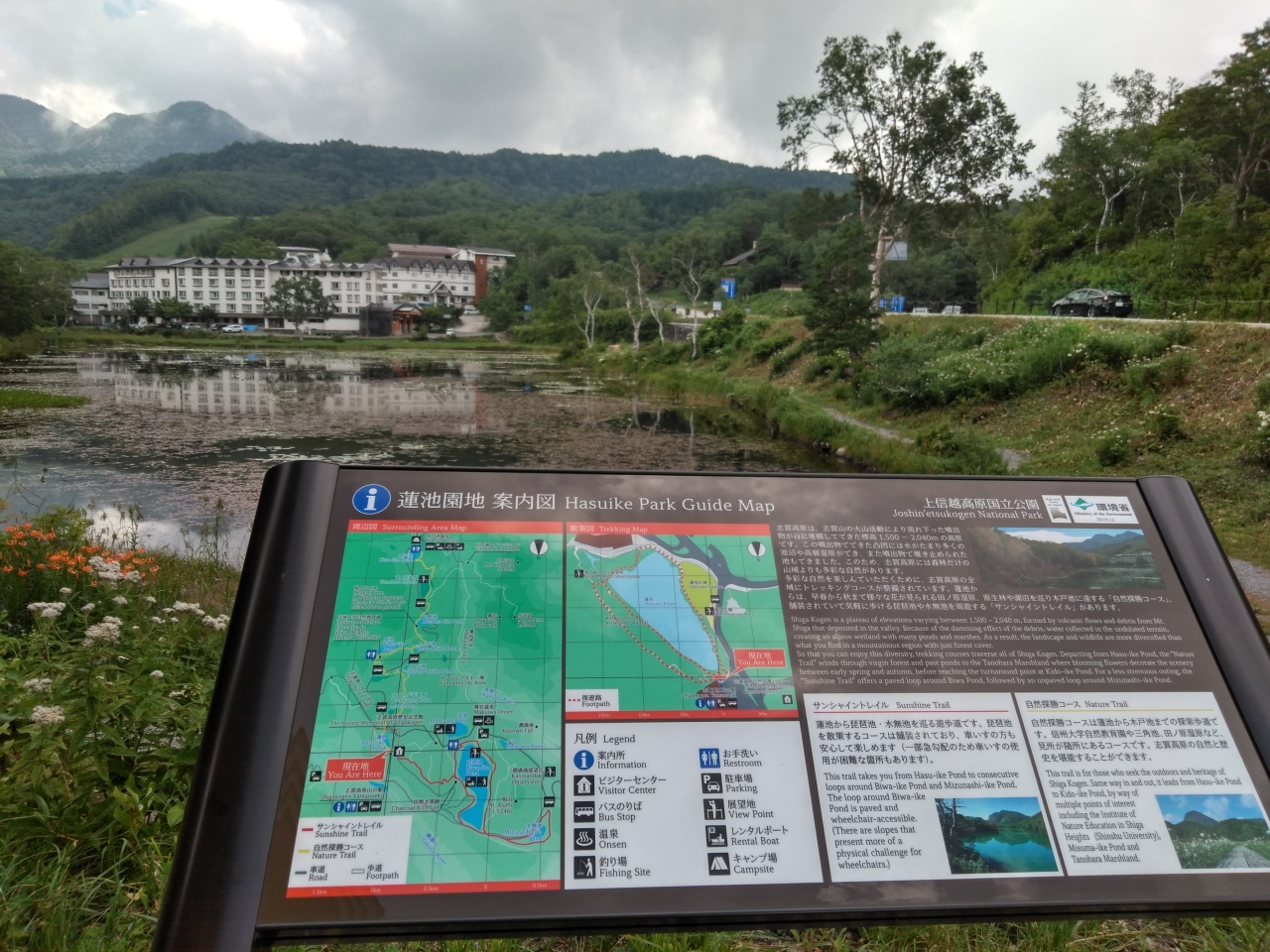 池の横に「志賀高原山の駅」があって、そちらに広い無料の駐車場があります。池は、さほど大きくはなくて、これといった特徴もありませんが、山の駅が楽しめるので、その駐車場から眺めたり、散策するのがお勧めです。