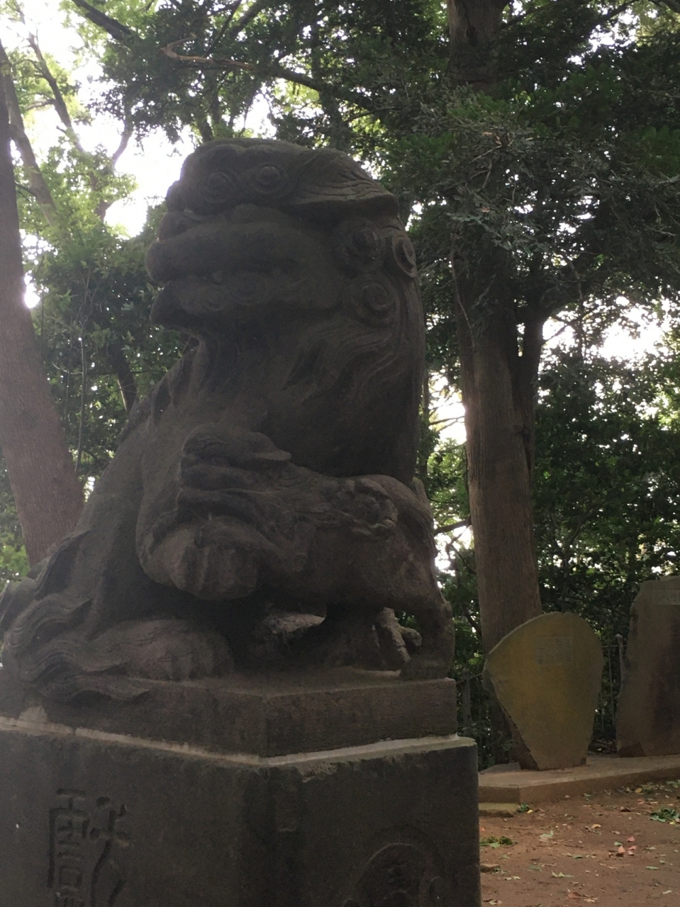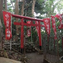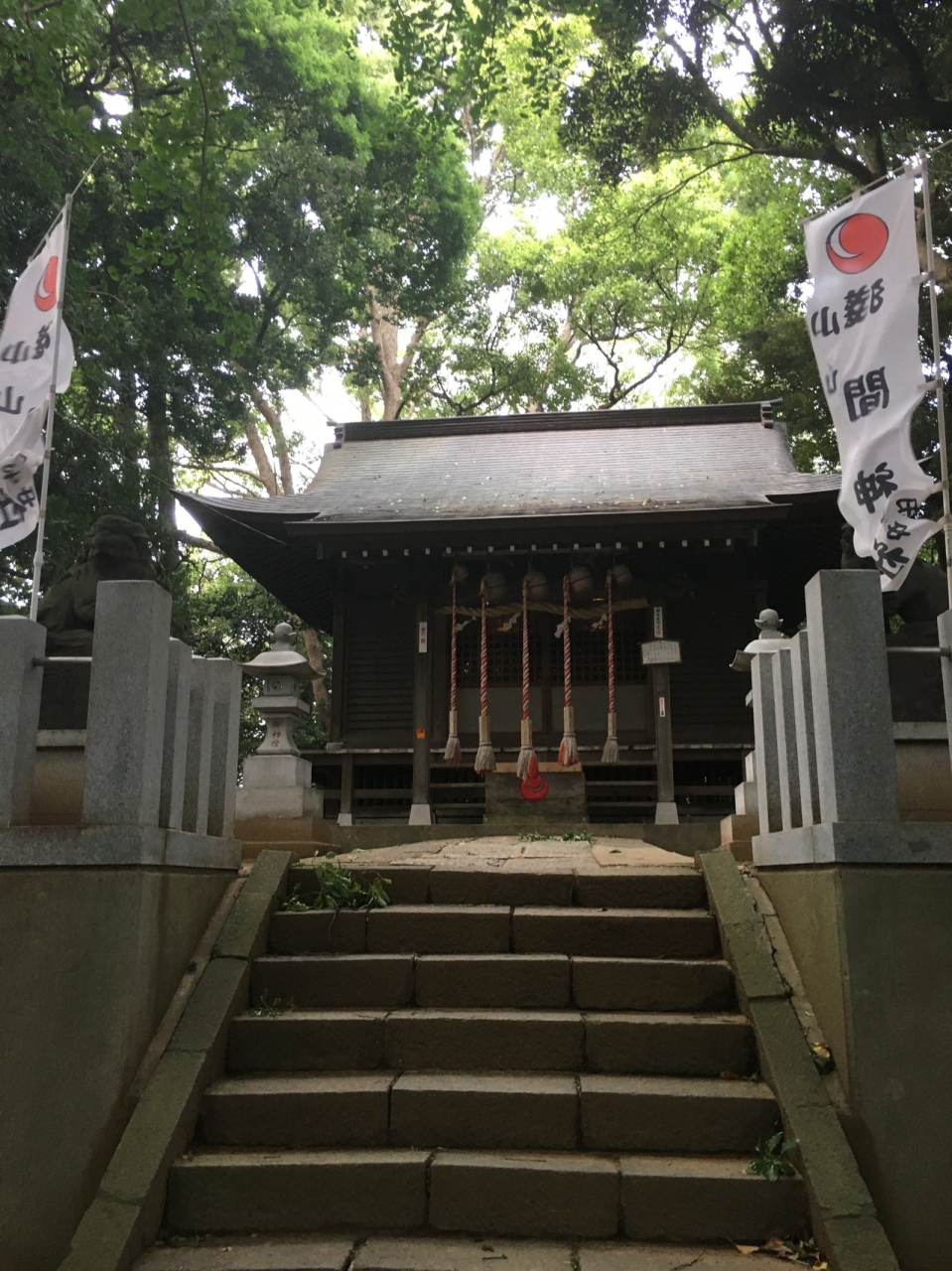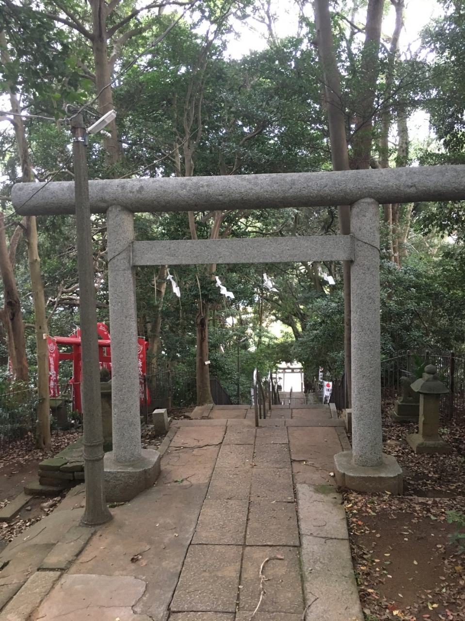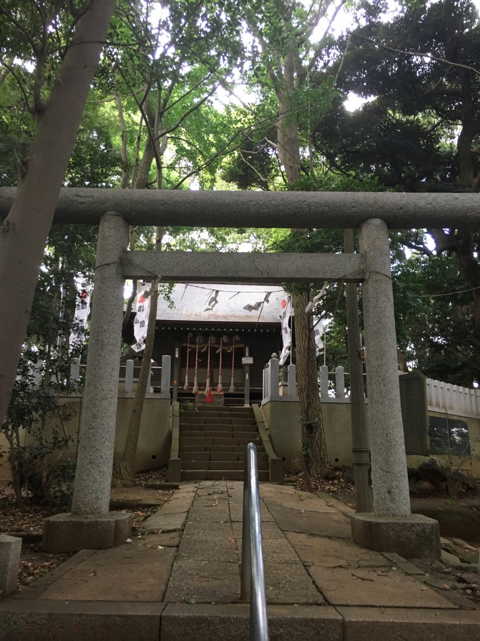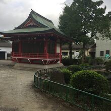 国道6号線から脇道入り直ぐの場所にありました。赤い神楽殿の横には池があり、社殿へは階段を上がって行くことになり左右には木々が生えていました。社殿の手前にはある獅子の像と子供の獅子像がありました。稲荷大明神もあります。