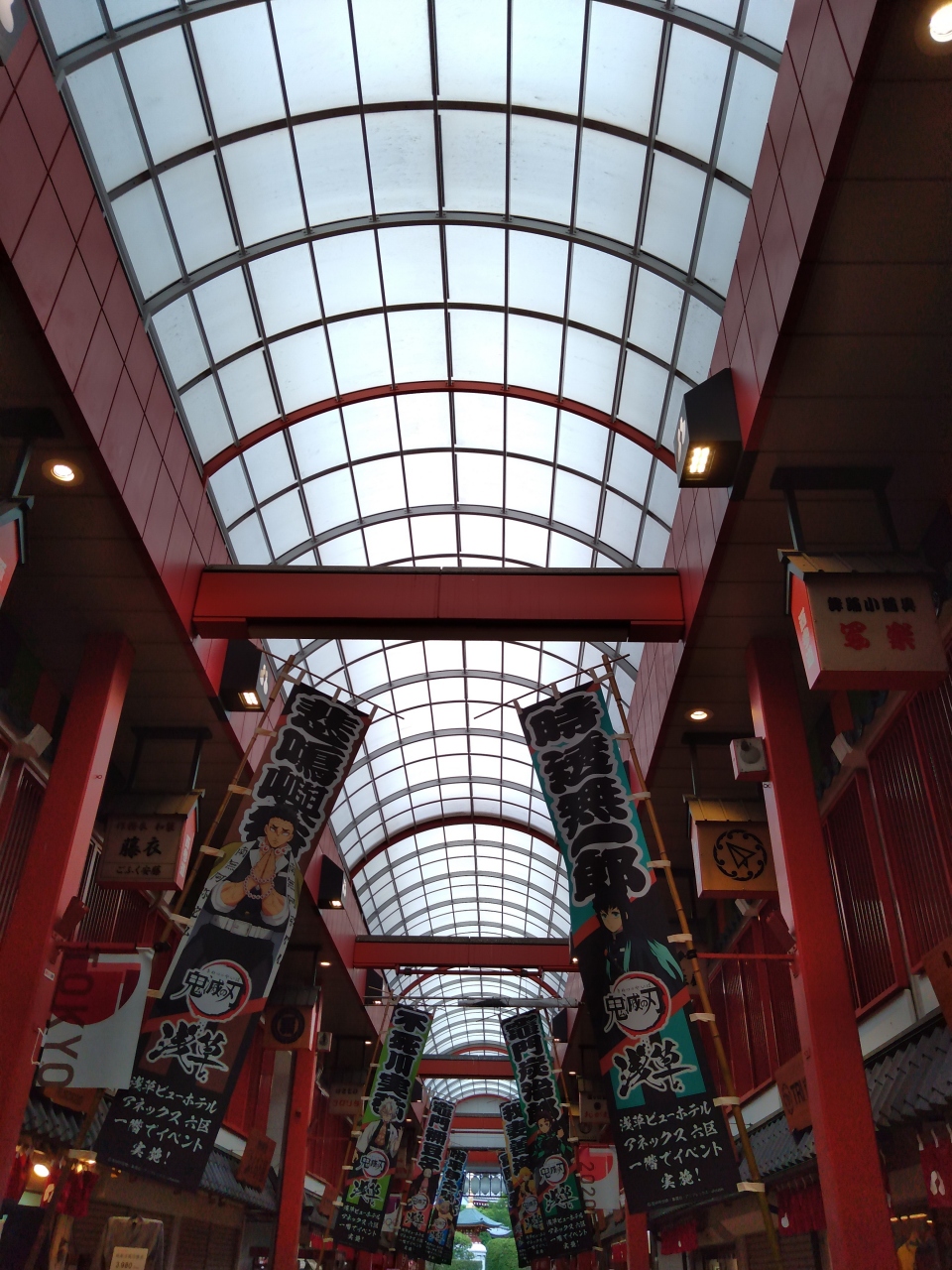 浅草寺のそばにあり、お祭りのような気分が楽しめるようなところですが、このご時世なのもあり、お店も空いてなかったり、閑散とした雰囲気が。でも「鬼滅の刃」 x 浅草 コラボイベントということで、のぼり旗がたくさん飾ってありました。