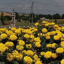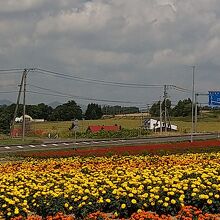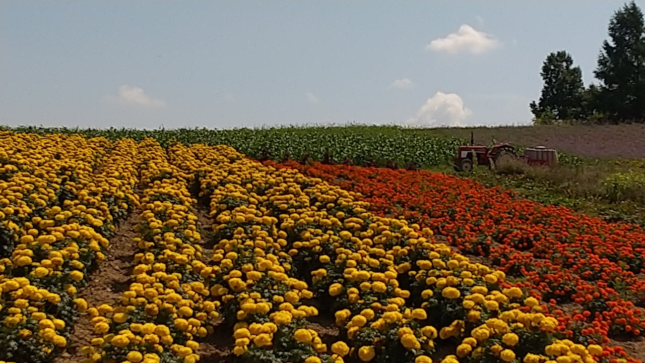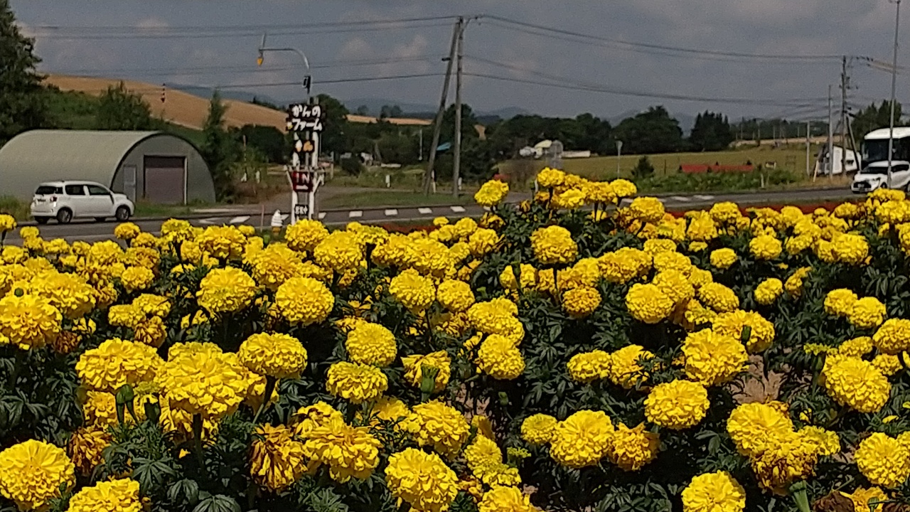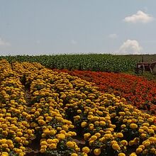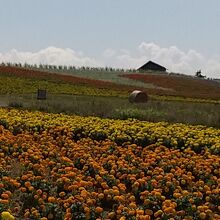 ラベンダーの時期は終わり、夏の花のマリーゴールド、ブルーサルビアが広大な敷地に咲き圧巻の風景です。