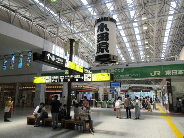 この「JR東海道本線」の利用者は多く西は神戸までと長く繋がっているようです。その途中の小田原駅に立ち寄りました。階段を登り改札口へすると衝撃の小田原提灯が目の前に驚きですね。ここ小田原は小田原宿として東海道五十三次のひとつの宿場町としても有名で小田原城などの見どころもあります。特産物は籠清の蒲鉾も有名でお土産にももってこいです。是非下車し小田原の街を散策してくださいね。