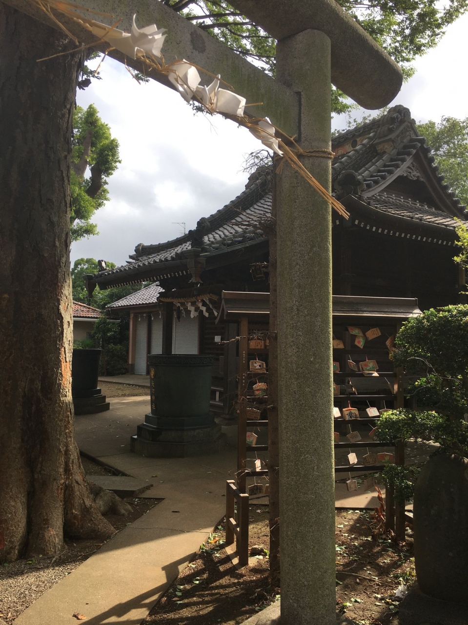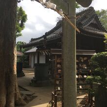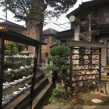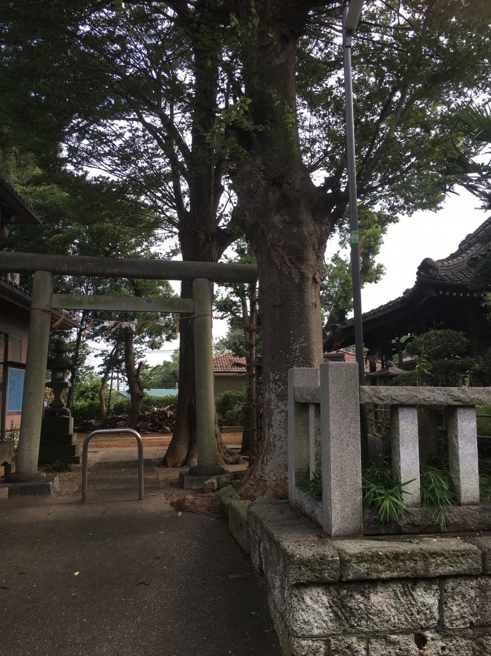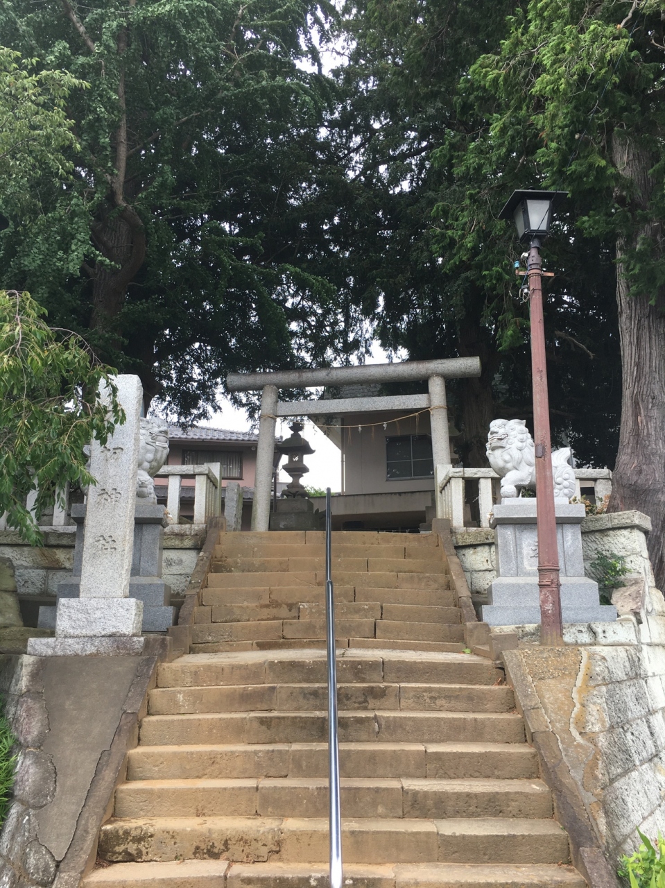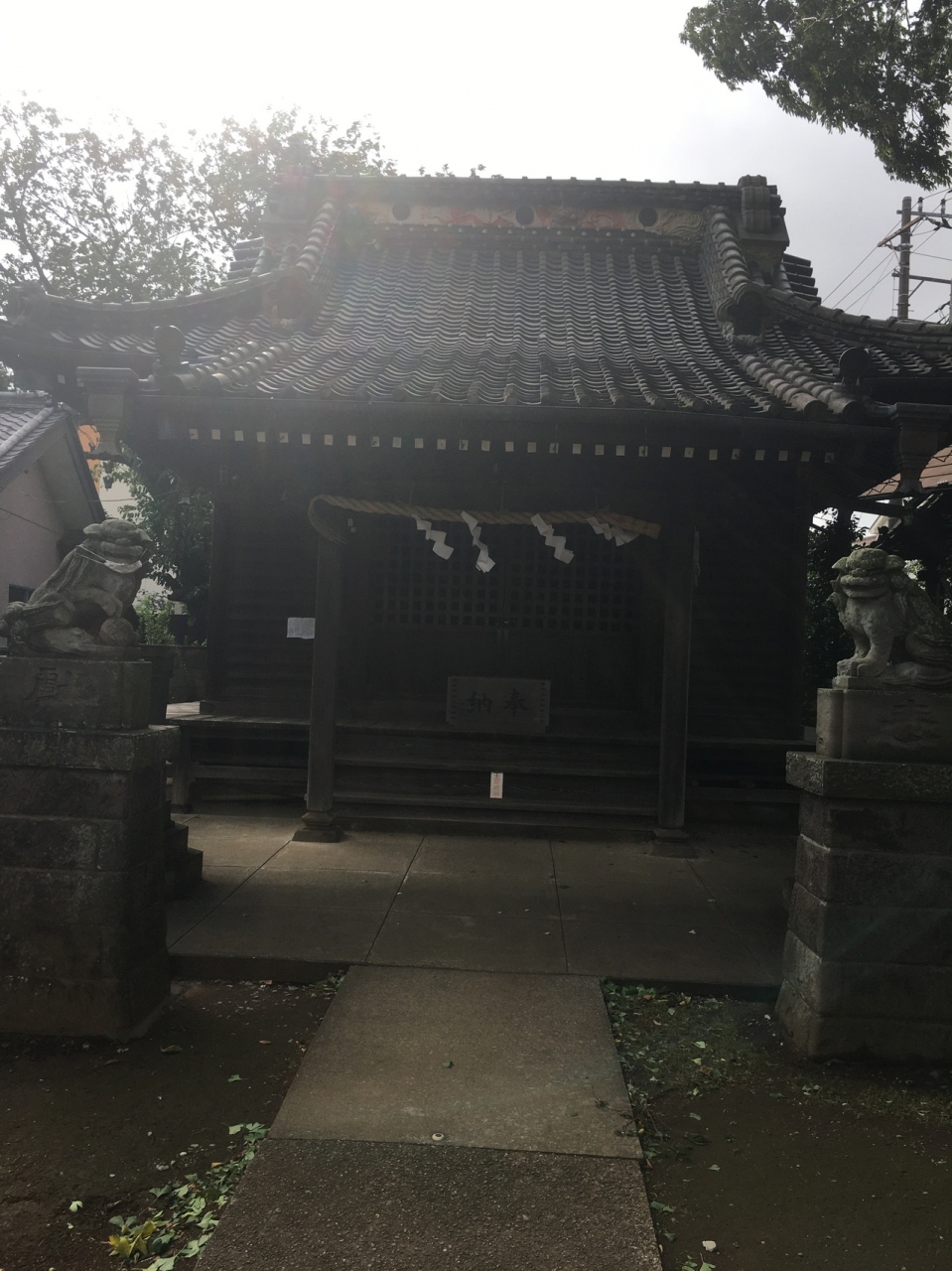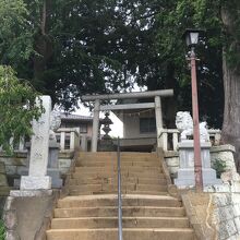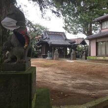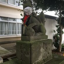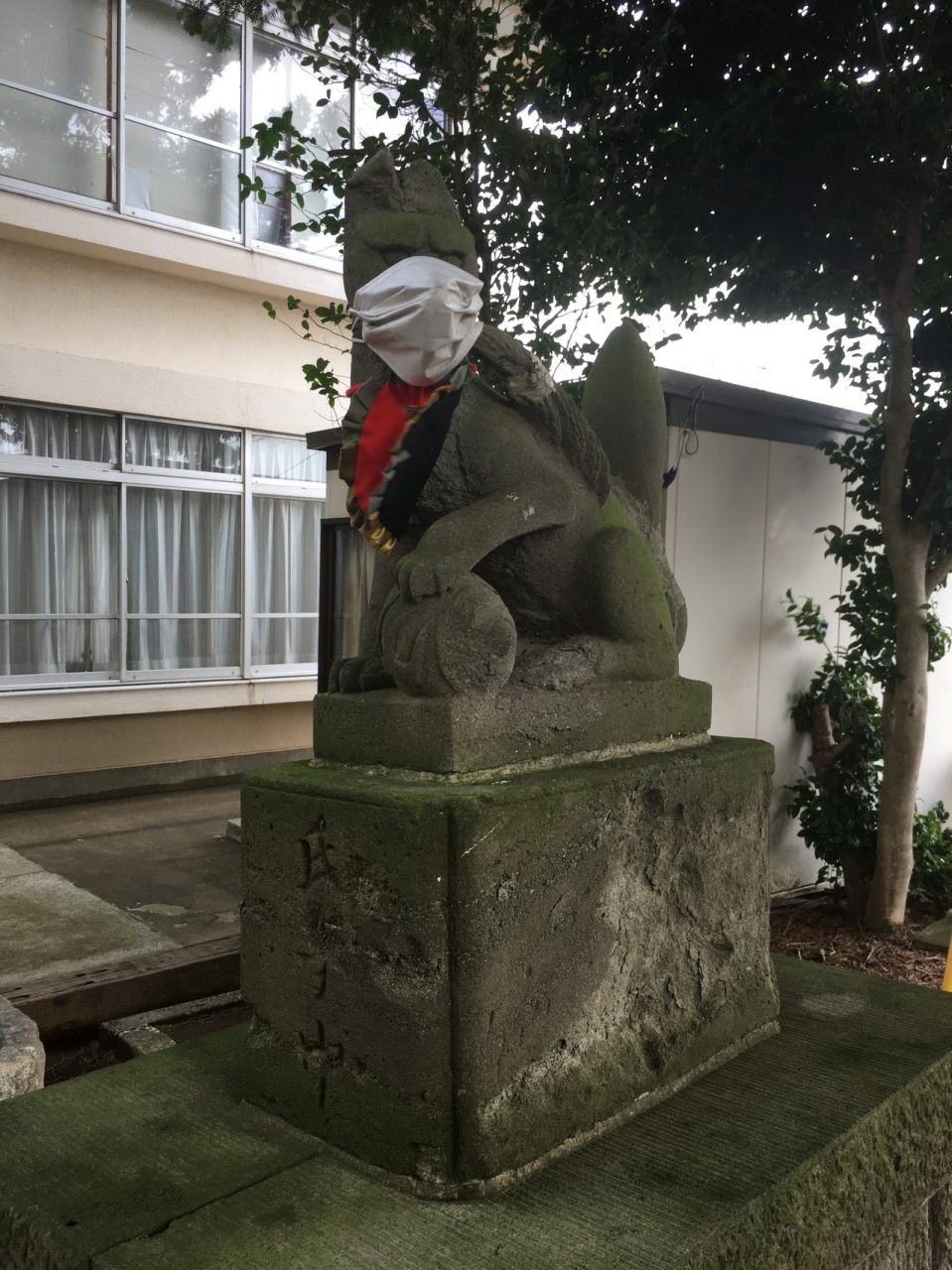 幹線道路から外れたところにあり階段を上がって境内です。社殿の前は空間にはなっていて、古い社殿で、横にはおみくや絵馬があり、祠もありました。大きな木が目立ち、別な出入口から出ると狭い道で住宅街です。狐の像がマスクをしていました。