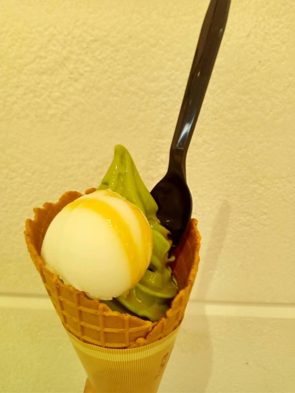 東京・お台場の「ダイバーシティ東京プラザ」の2Fに出店している『ナナズ グリーン ティー ダイバーシティ東京プラザ店』にて、期間限定メニューの『はちみつレモン抹茶ソフトクリーム』が販売されていたので購入しました。抹茶ソフトクリームと対象的なはちみつレモンのシャーベットが入っていて、美味しかったです。