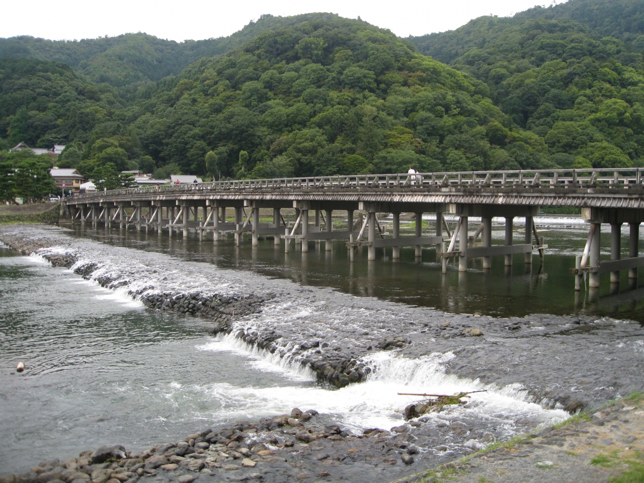 天龍寺の正面入り口あたりから、お店が続いているので、ブラブラしながら楽しめます。ちょうど付きあたりが渡月橋で、人力車の客引きが多いです。無視して下さい。渡月橋は、離れた場所から橋を遠望するのが良いので、少し川岸を歩き、離れてから撮影する良いです。