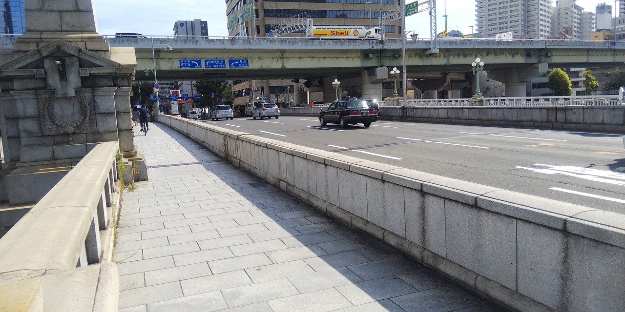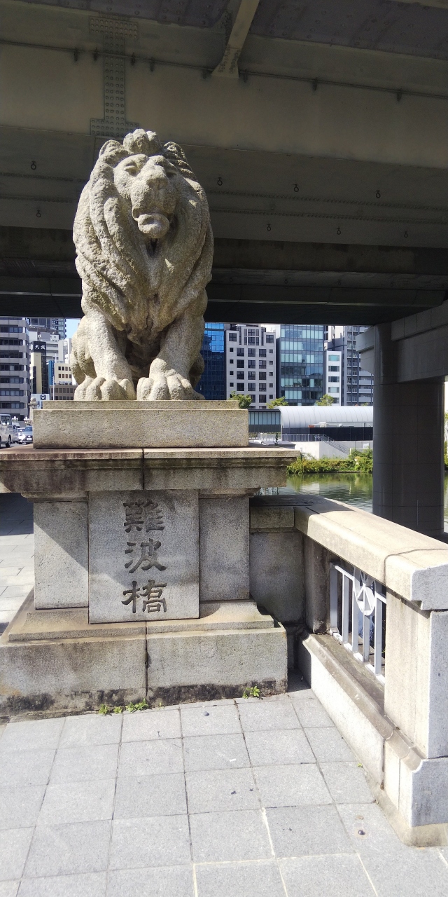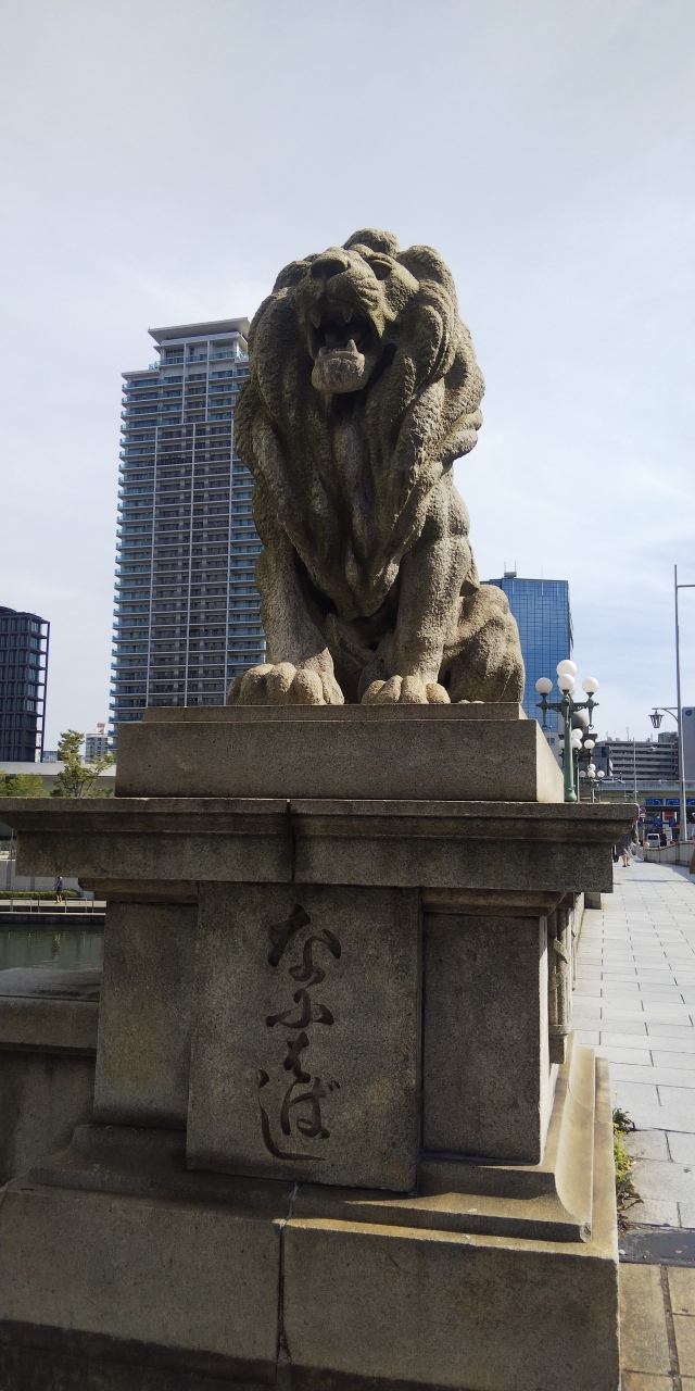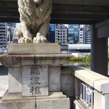江戸時代からあり、何度かの架け替えを経て現在の石造りの橋になっています。等身大ぐらいの大きさのライオンの像があることで、「ライオン橋」の愛称で親しまれている大阪を代表する橋のひとつです。車道は北向の一方通行です。