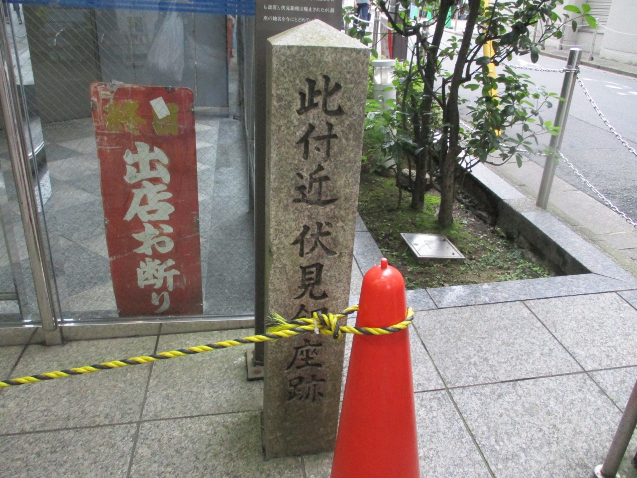 伏見大手通商店街 近畿労金の前に碑があります。最初隣の銀行の前にあるのかと勘違いしていました。関ヶ原の戦いに勝利した徳川家康(1542~1616)は、慶長6(1601)年5月通用銀の全国統一を図るため、伏見のこの地に初めて銀座を設けました。四町にわたって会所や役宅が置かれたそうです。そして慶長13(1608)年に京都に移転しました。町名、通り名などに名残が残っています。