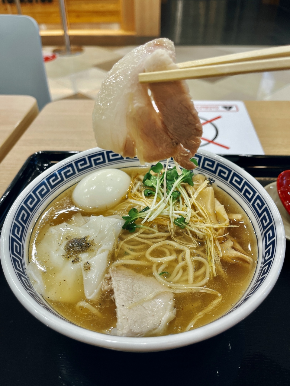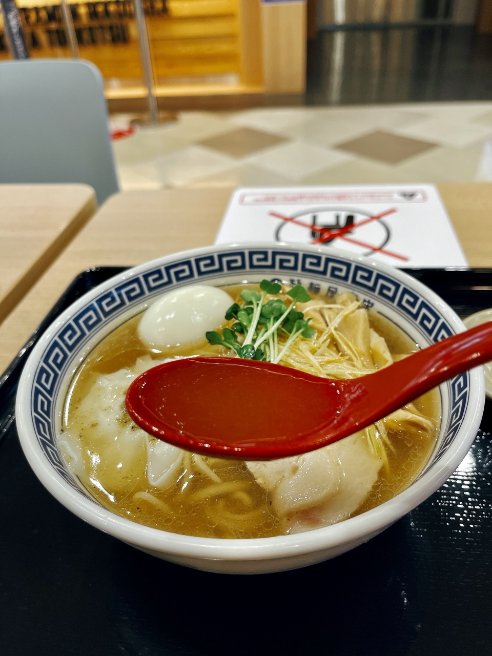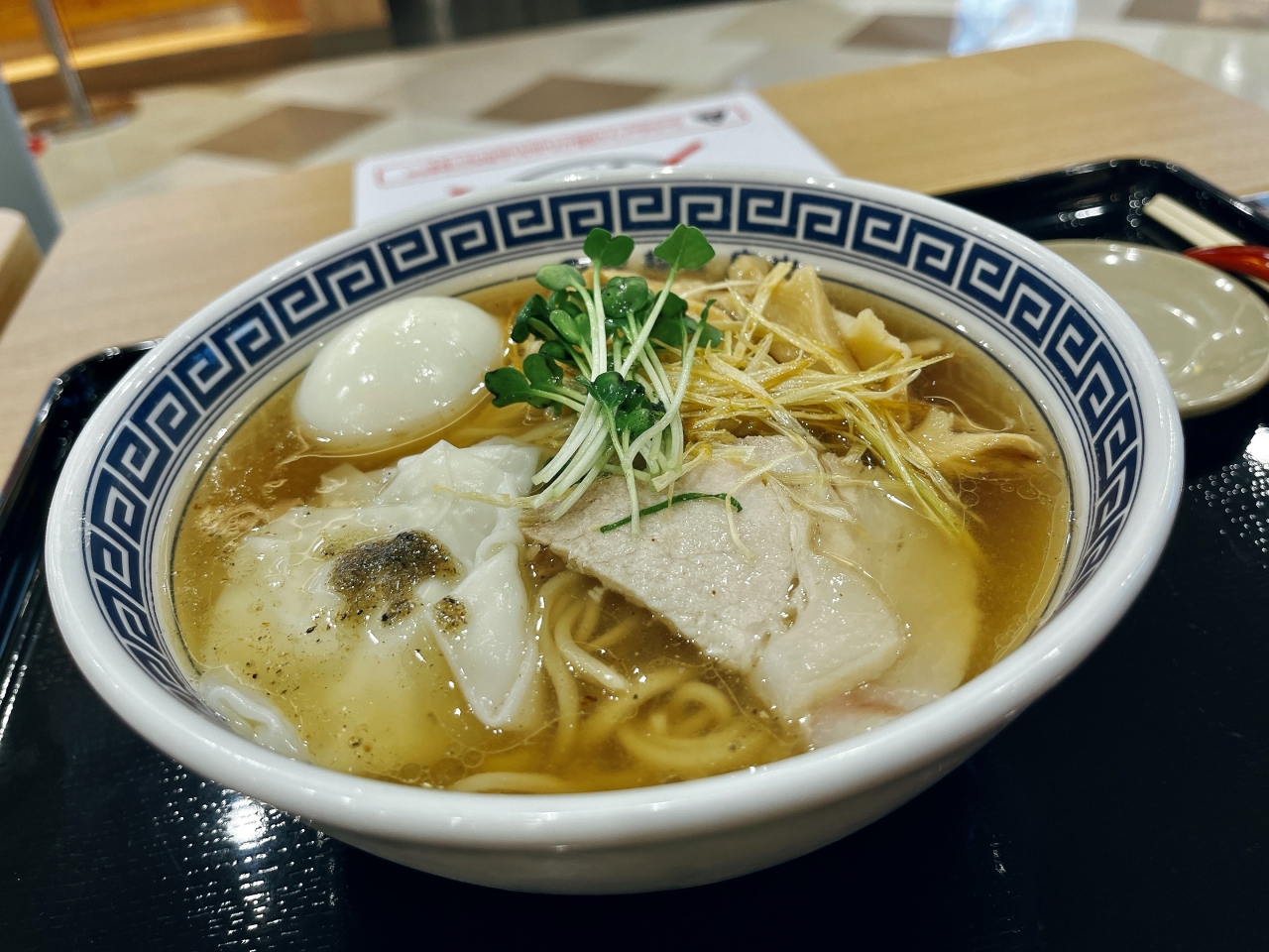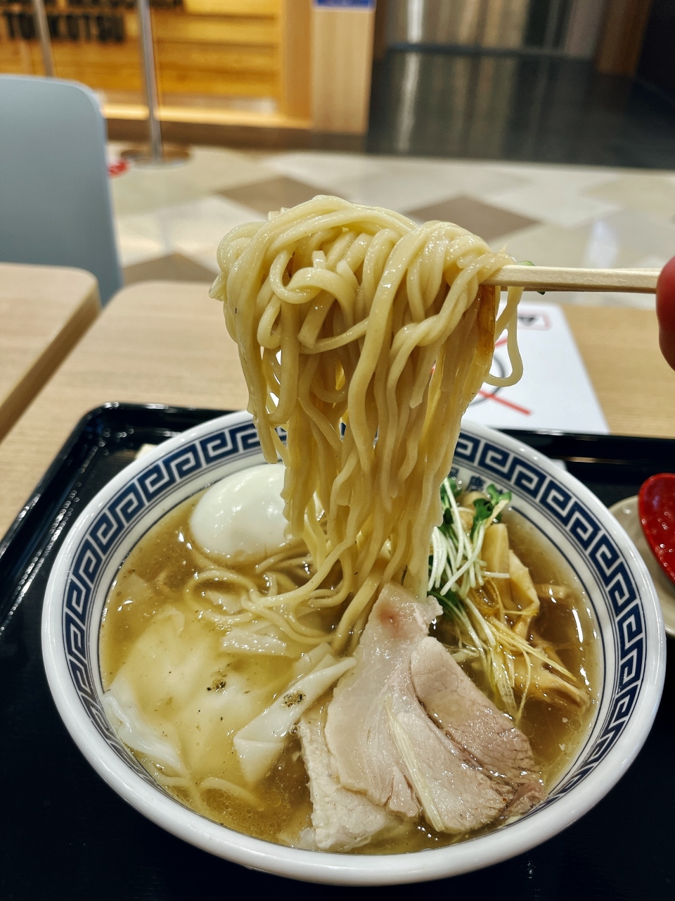 このイベント8月14日までなので訪麺しようとね・・・頂いたのは3位入賞した「煮干しそば 和」です!先ずはスープから〜おっ美味しい!博多豚そば「味玉淡麗清湯」に「煮干し」をブッキングした仕様で「淡麗清湯」&「クリアー豚骨」の良さは残しつつ「煮干し」の味わいと香りが優秀!フードコートで食すレベルを超えていますね〜コレは上位入賞するでしょうっていった感じな仕上がりでした〜ただ合わせられてる「課題麺/乱切り」は「リングイネ」のような中太平打ち麺で加水率もまあ高めで悪くないけどこのスープに合ってないのだけが残念でした。