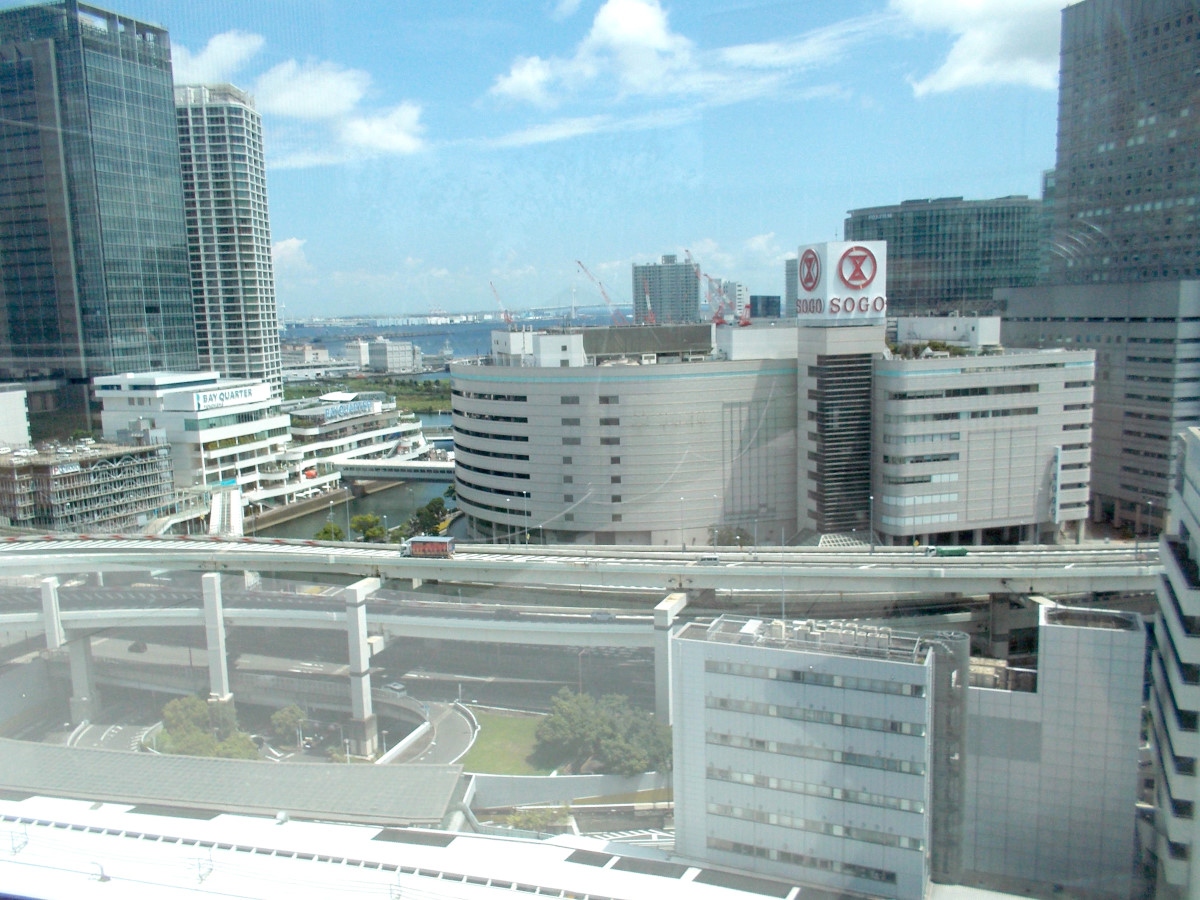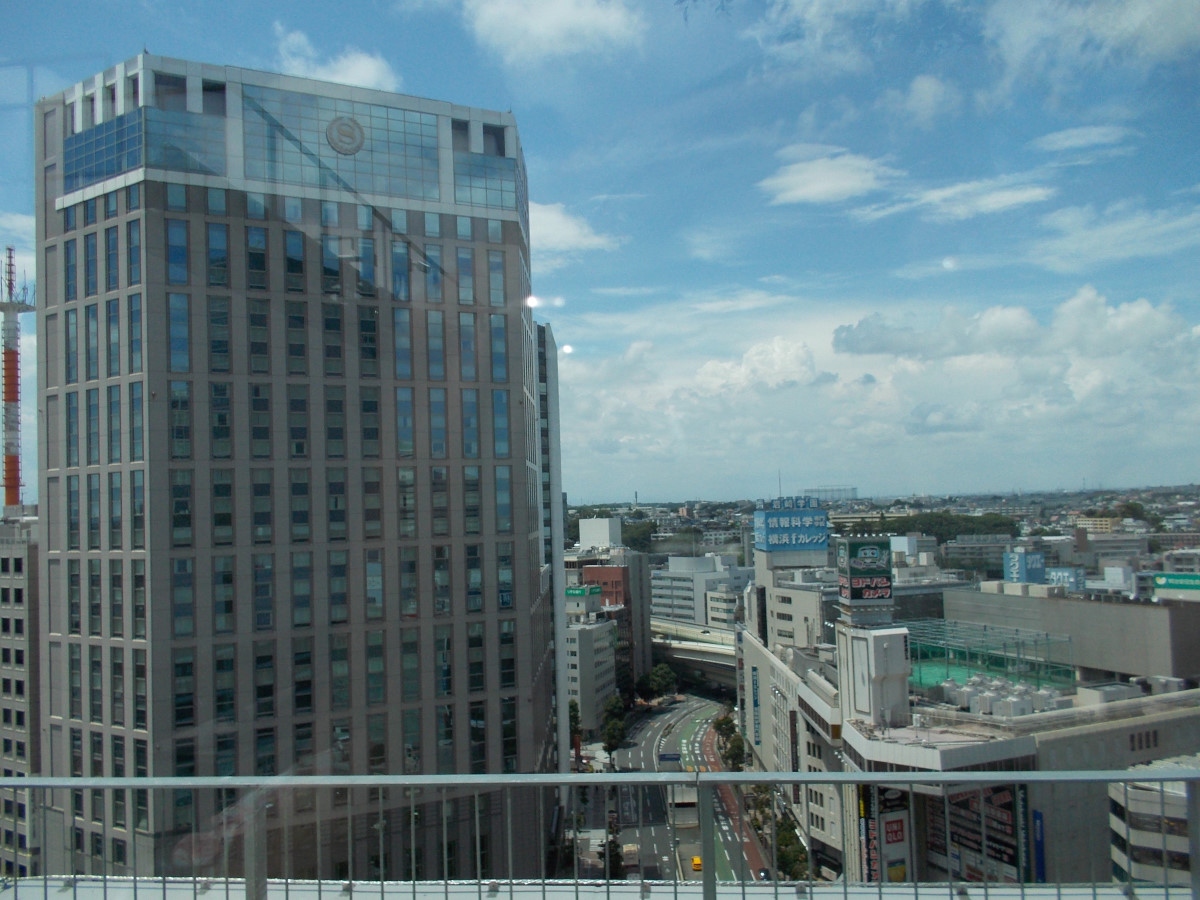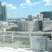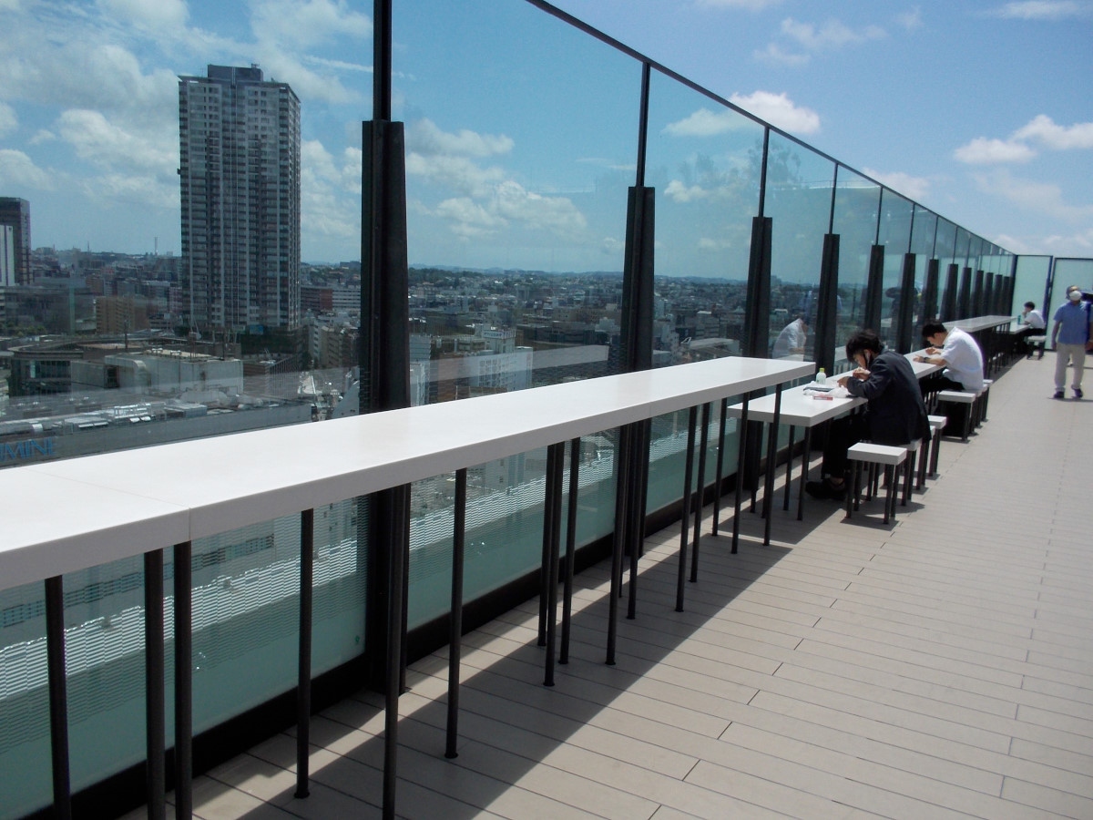 さてその場所はビルの12階、海側に大きく開けた構造となっていて、海とともに駅東口のビル群や鉄道を眺めることができます。植栽にベンチ・テーブルも設置され、小休止するには良いかもしれません。