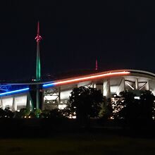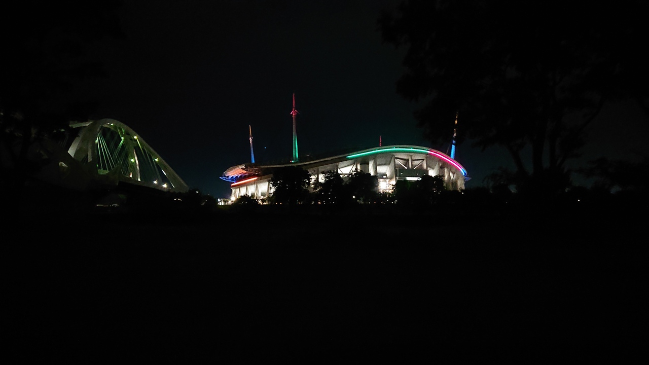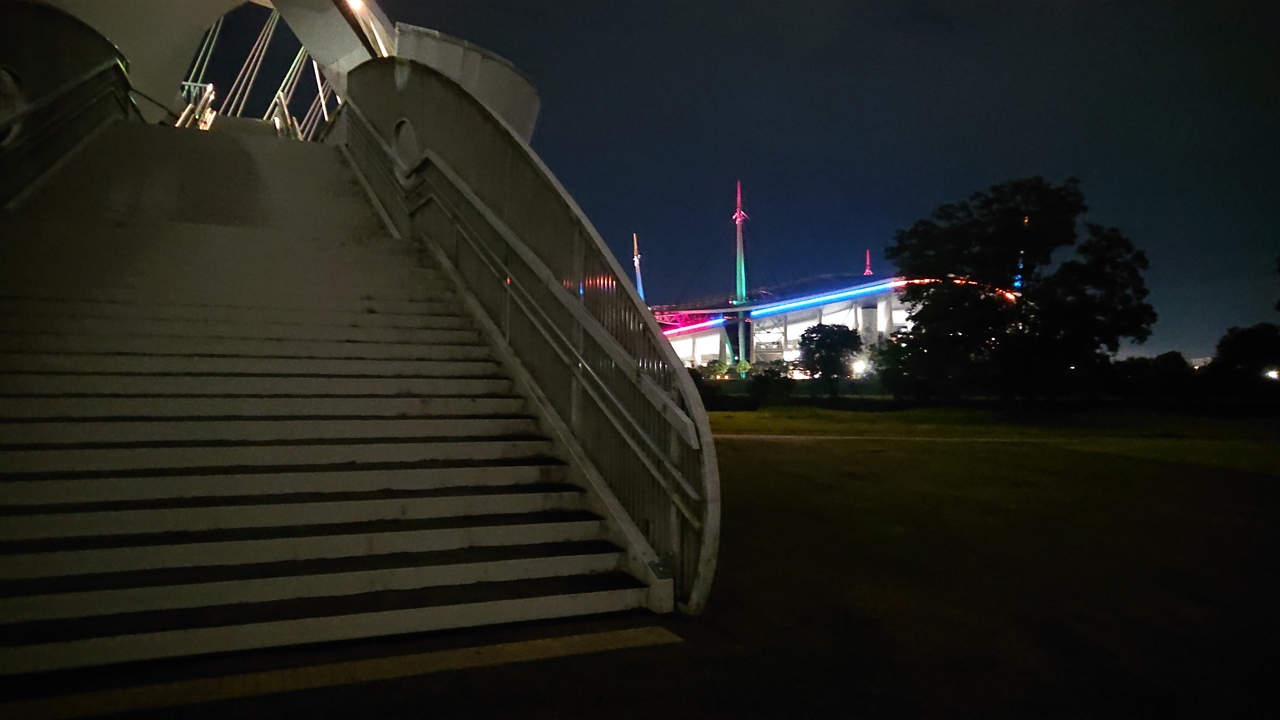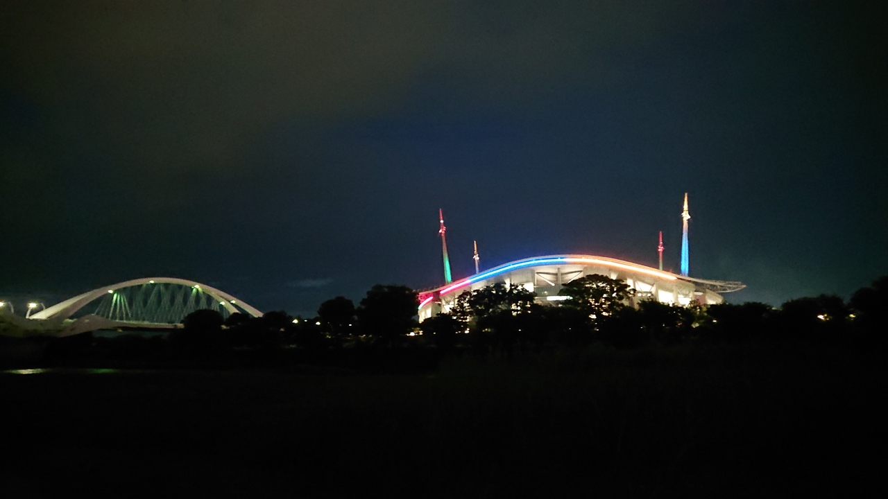 7月下旬の19時台に訪問。白浜公園内を、久澄橋側から豊田大橋側まで歩きました。周囲にはまだ薄明かりが残っており、ギリギリ散策できる位の明るさはありました。また、対岸の豊田スタジアムで行われていたライトアップが綺麗でした。