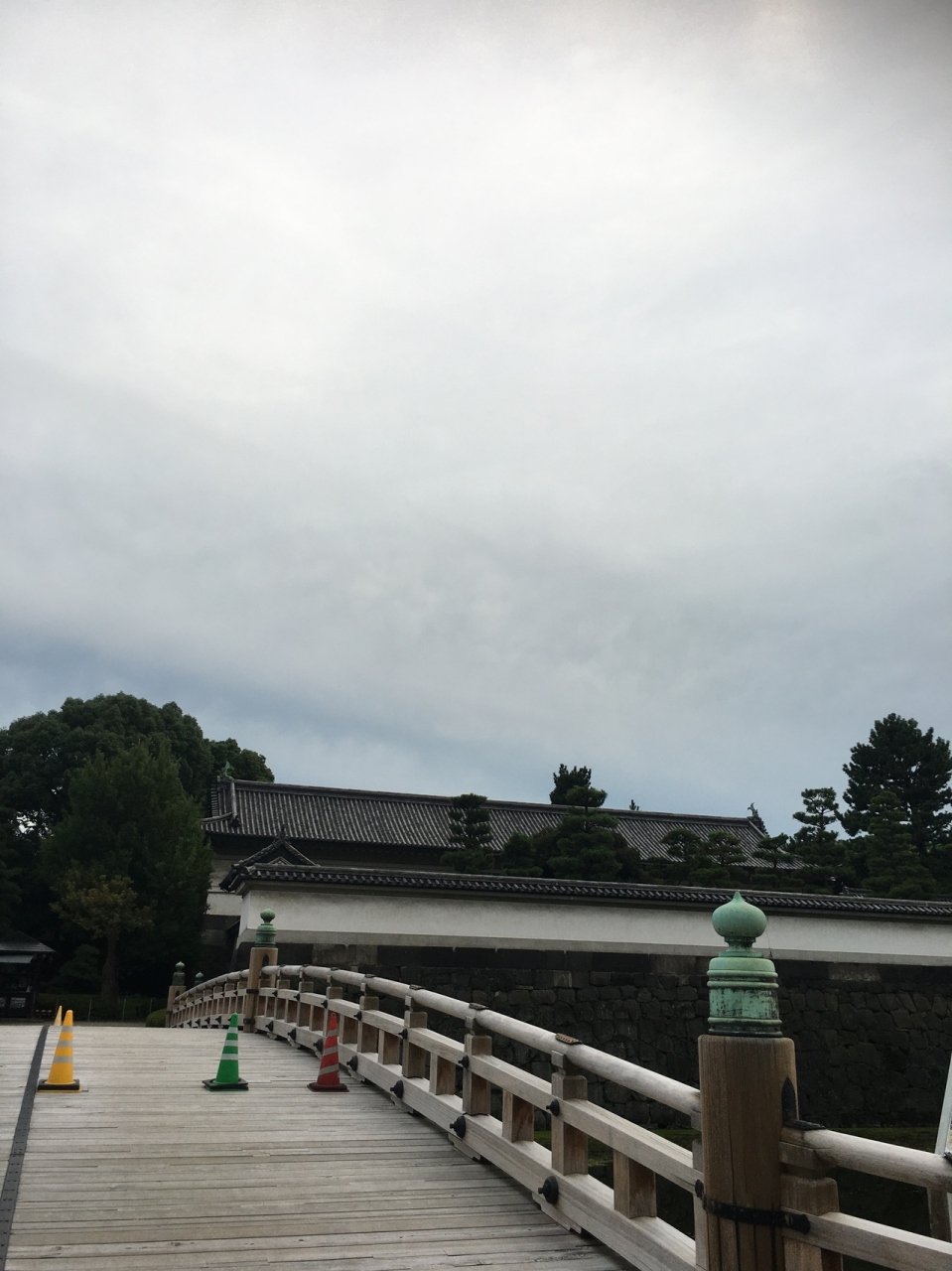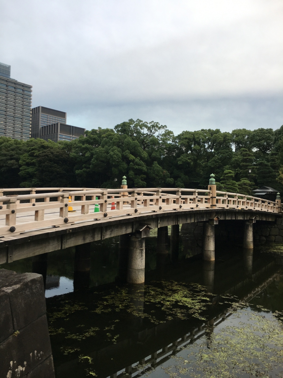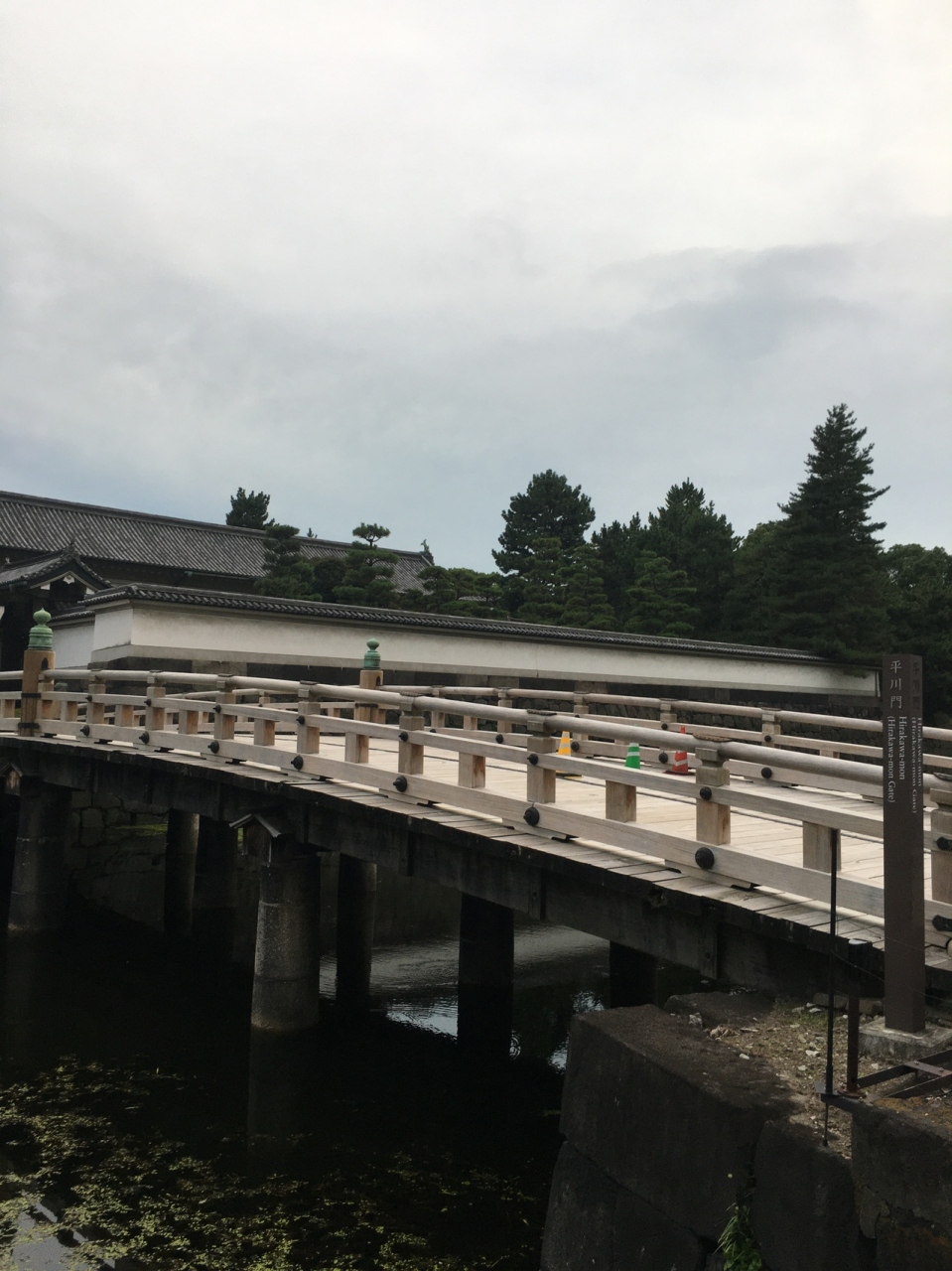 江戸城の濠に時代劇に出てきそうなすこし丸みを帯びた木の橋を渡って行くことになりますが渡れる時間は日中のみとなります。江戸城の濠に沿った門で、綺麗な松が生え、建物が石垣に沿った門で、よく城で見かける門構えでした。