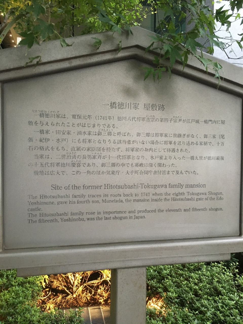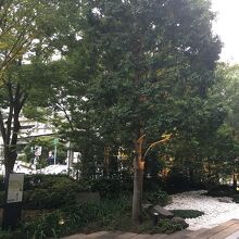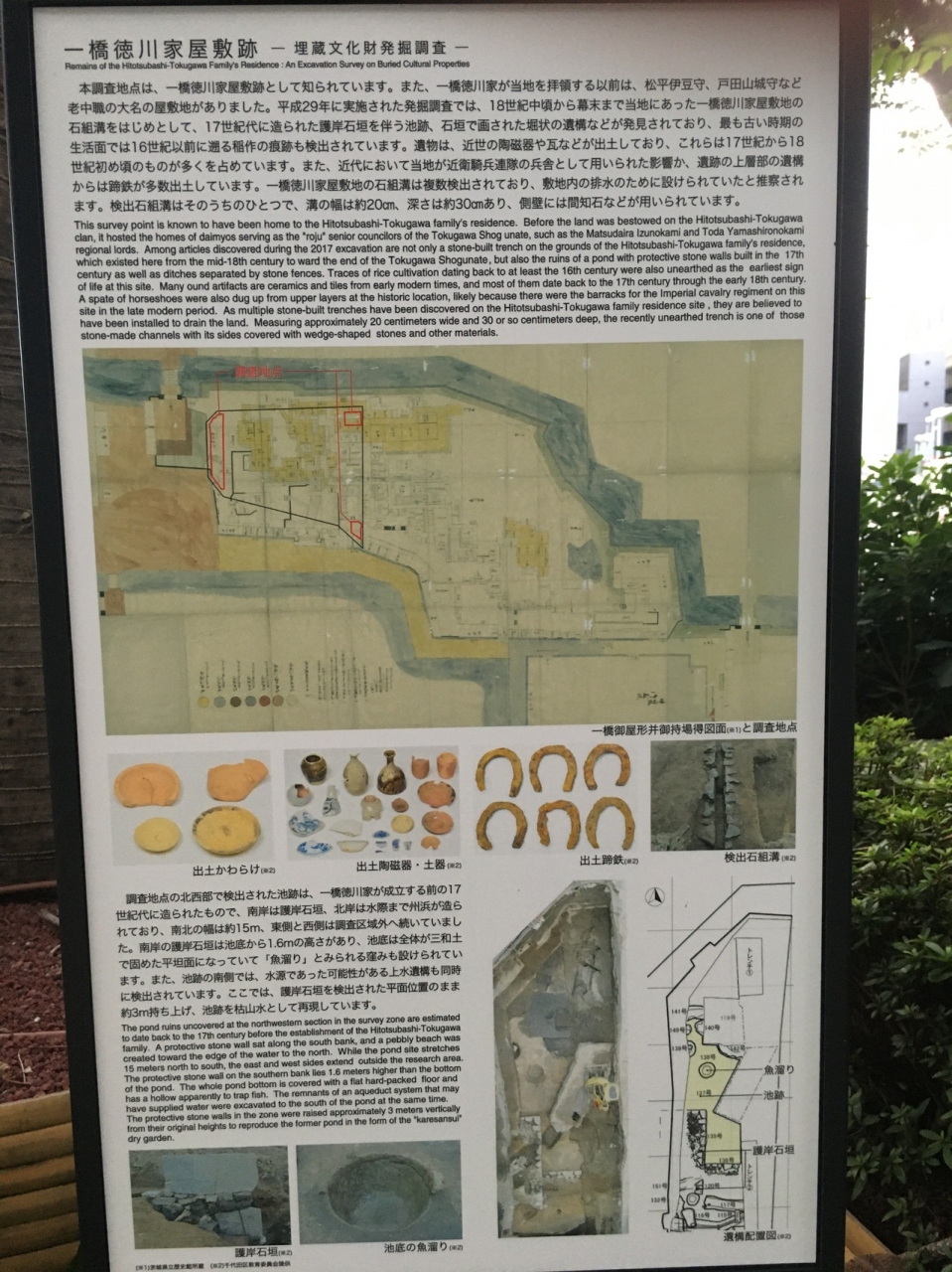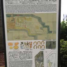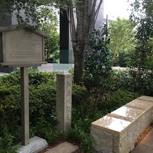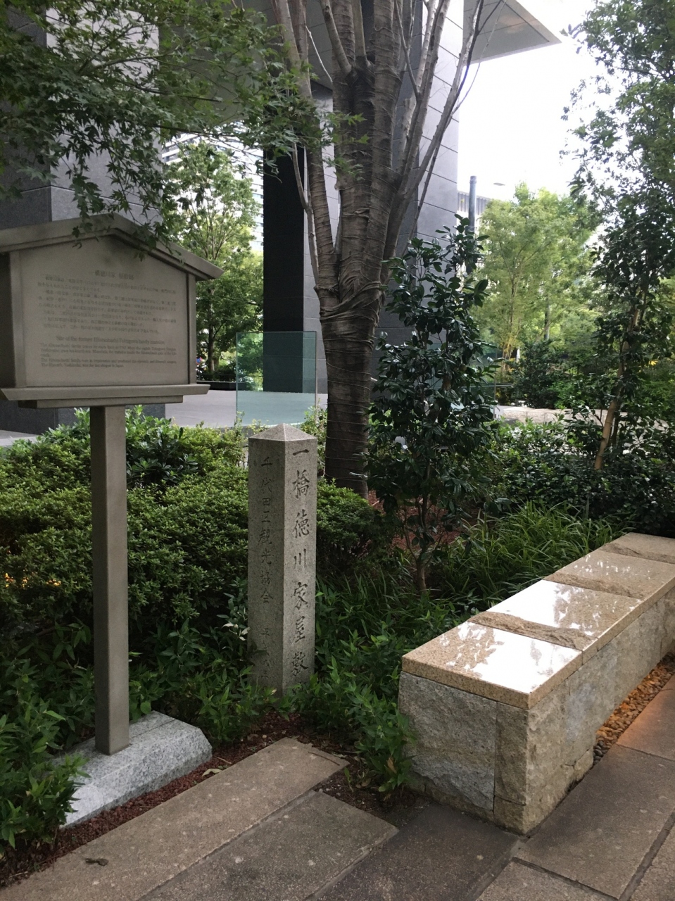 丸紅本社ビルの横にあり、木々が生え整備された場所にあり、ベンチもありました。木々があるため木陰になっているので暑さを凌ぎました。当時の地図が掲載されていて、出土された陶磁器の写真の記載もありました。広大な敷地だったようですが現在はひっそりとした場所でした。