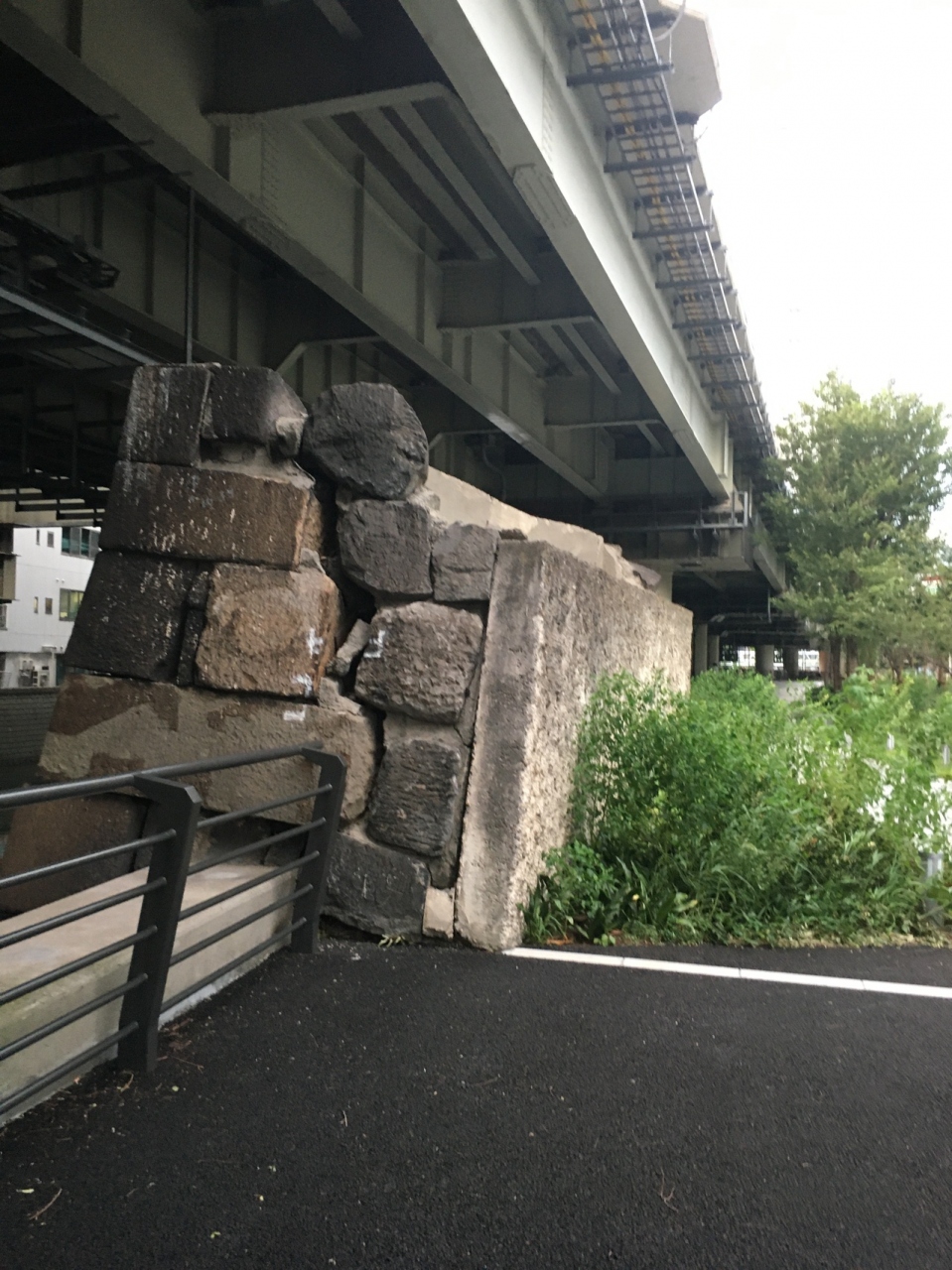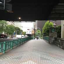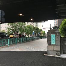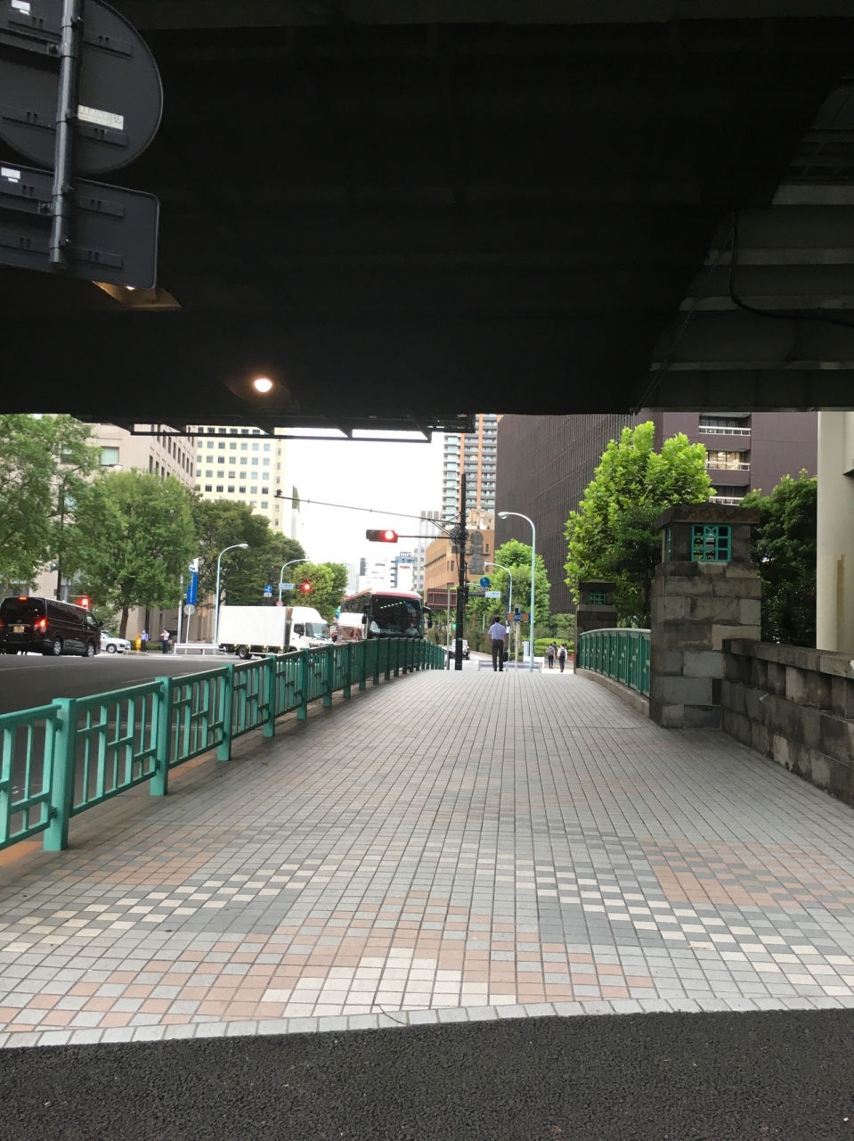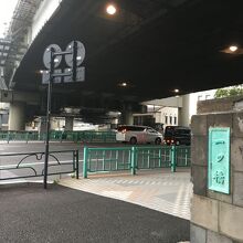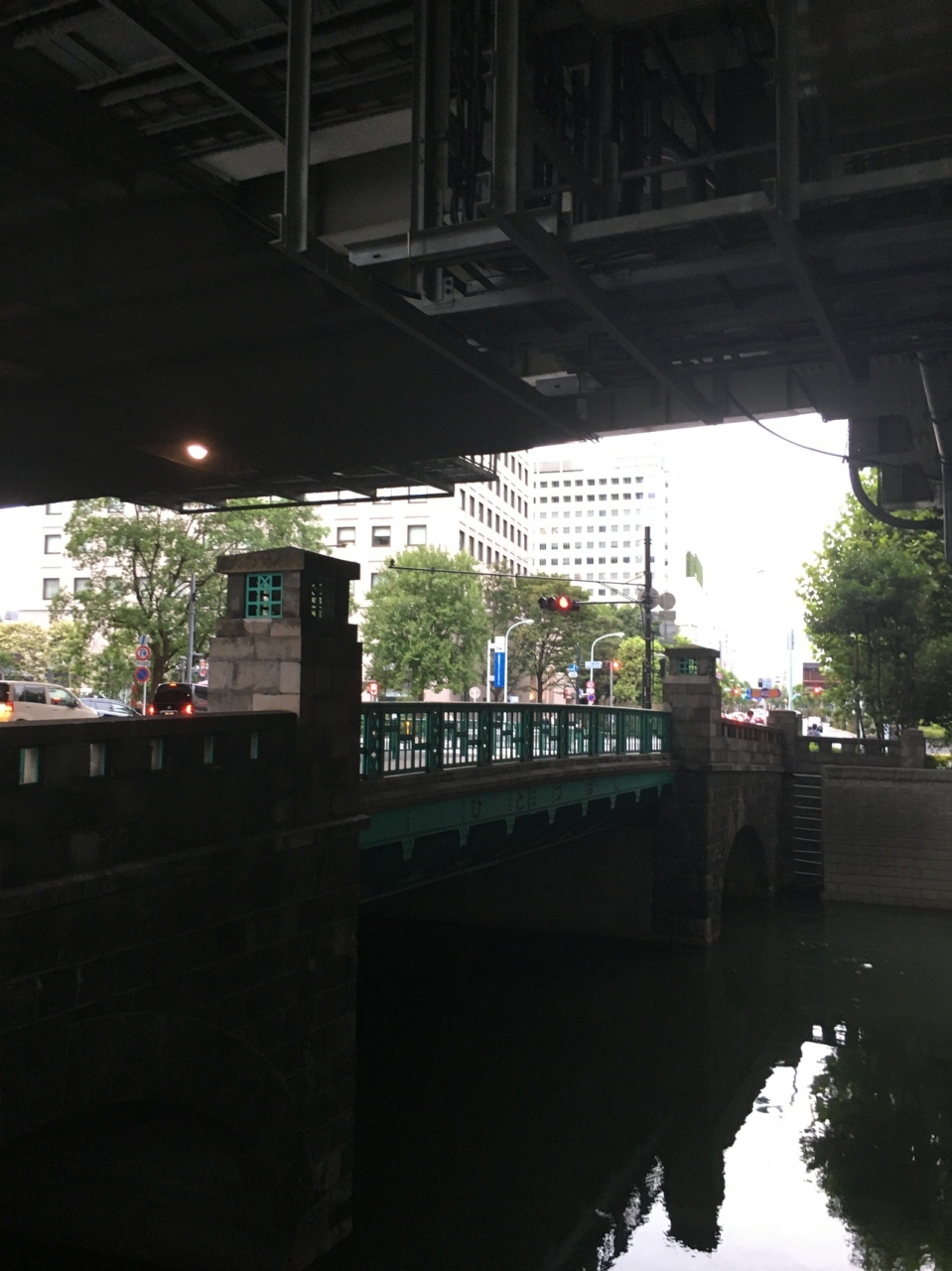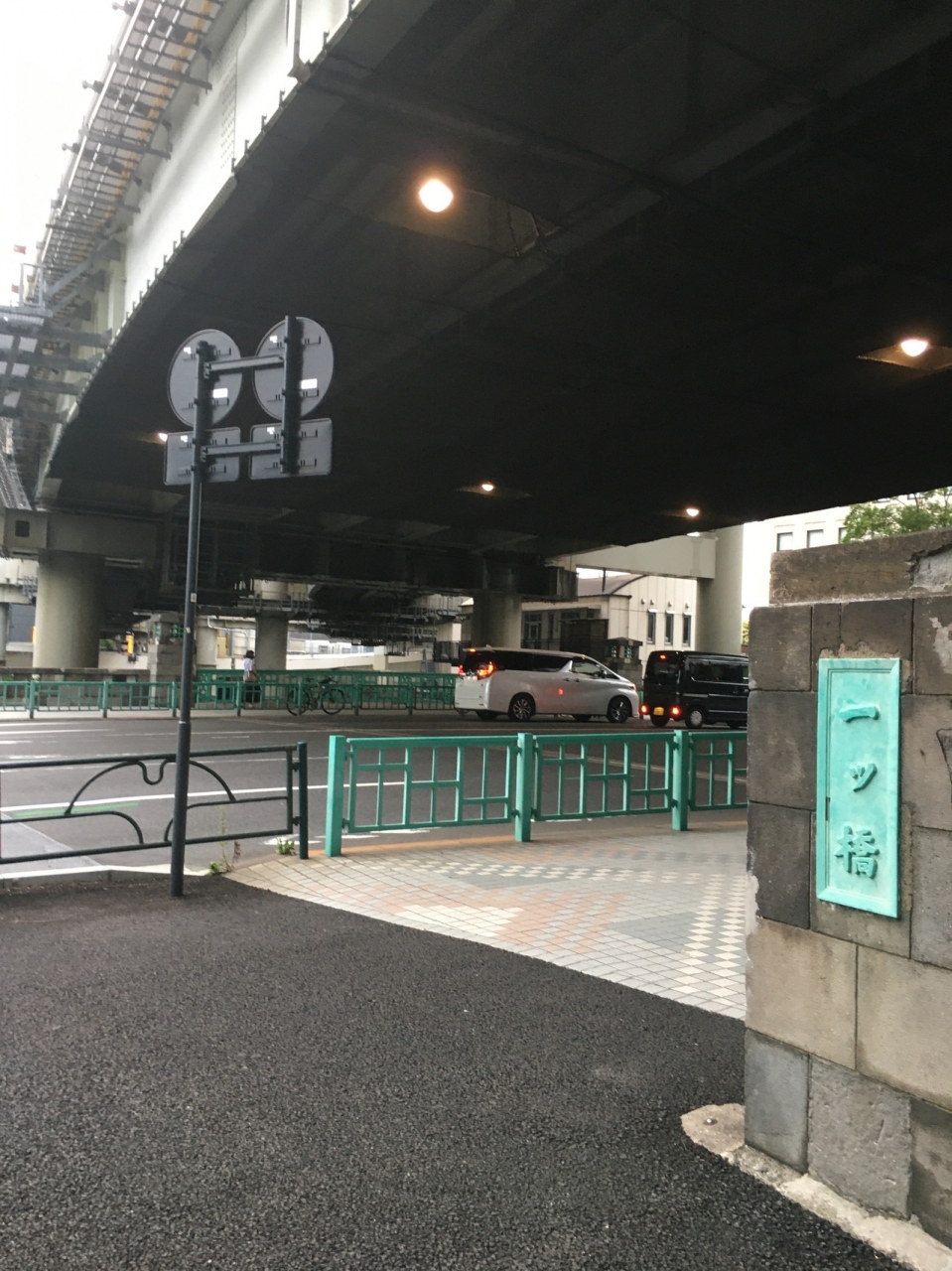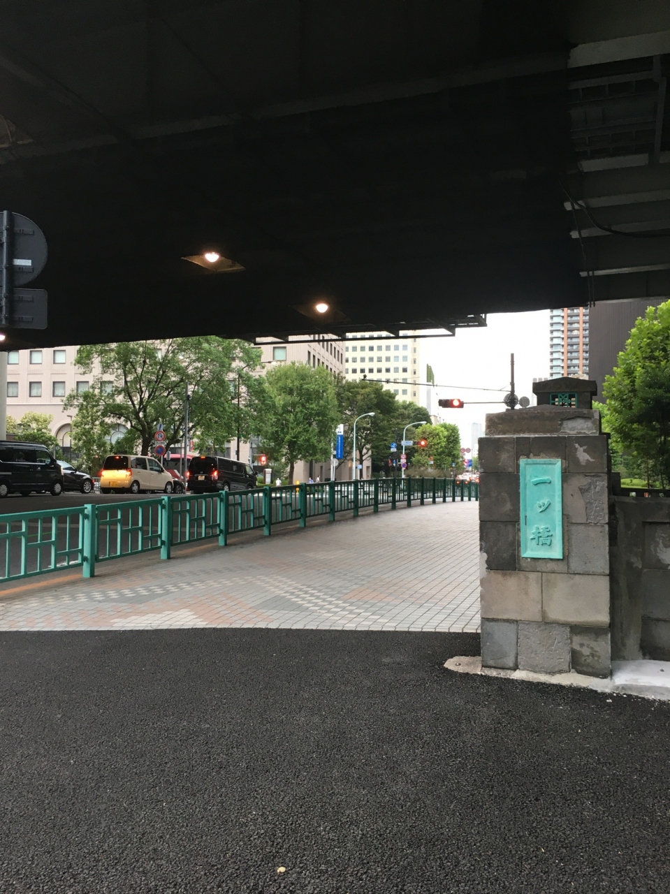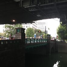 丸紅本社ビルの直ぐそばにあり、橋の上には首都高速道路が走っていました。丸紅本社側から渡ると右側に大きな石垣があり、橋の下の川は濁っていました。橋の左右が石で、中央が鉄筋のエメラルドグリーン色でした。車道と歩道があります。