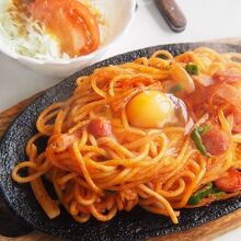 鉄板ナポリタンは、熱々の鉄板上にナポリタンが盛られていて、中央に生卵が落としてある。生卵をパスタと絡ませると、余熱で卵に火が通っていき、全体の味も変化していく。。