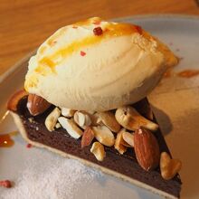 タルトの型に、チョコレートとフランボワーズを混ぜ合わせた生地を流し込み、ナッツを重ね、バニラアイスをトッピング。
