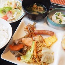カレー焼きそば、焼き魚、ウィンナー、卵焼き、筑前煮、冷ややっこ、きんぴらごぼう、サラダ、味噌汁、パンが提供されていた。