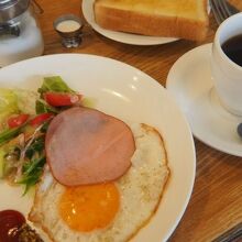 メインのプレートに目玉焼き、ハム、サラダが盛られ、別の皿でバタートーストが提供される。