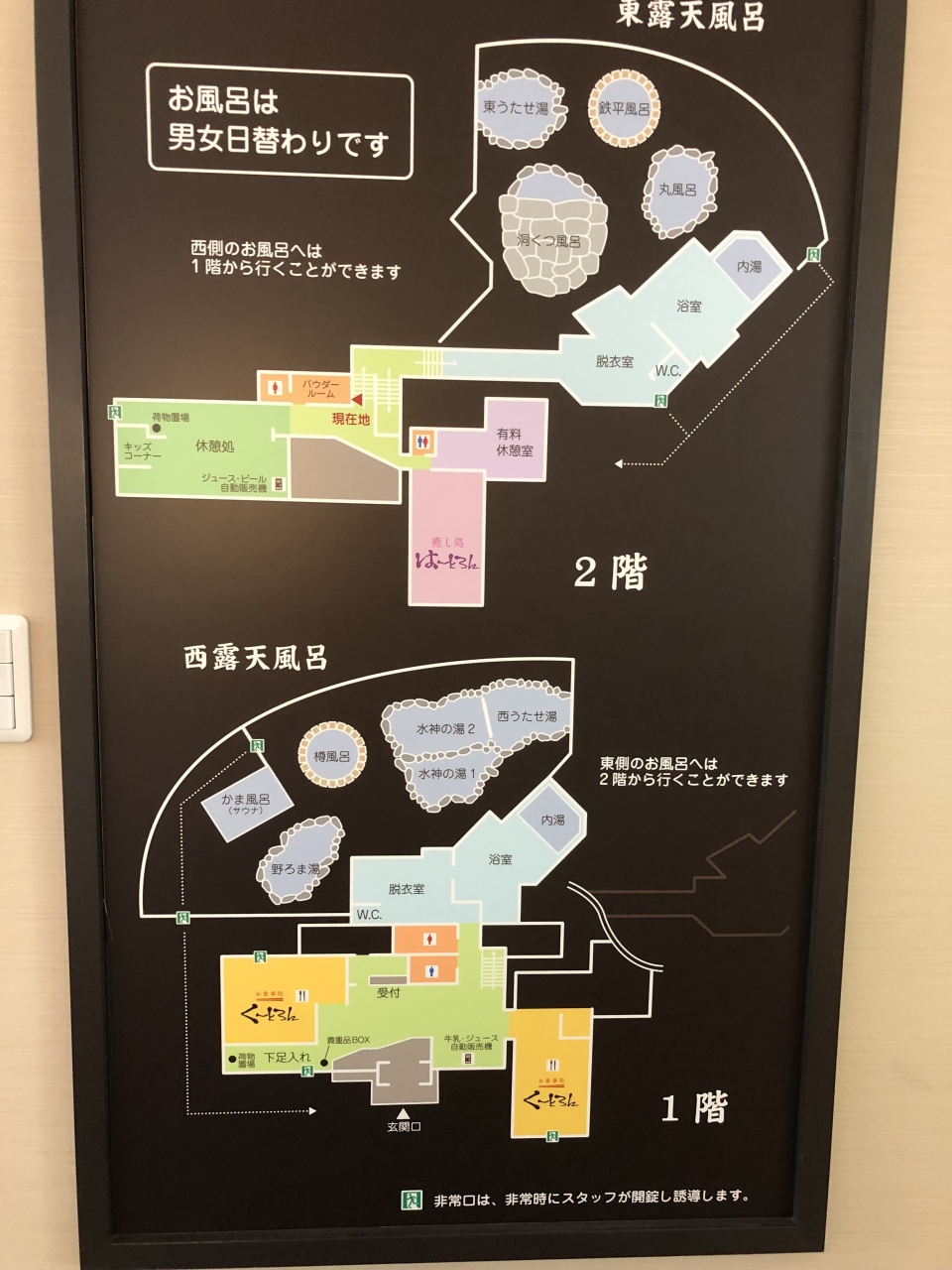 2018年暮れにリニューアルしてから初めて入浴しに訪れました。以前と比べて靴置き場やフロントがゆったりしていました。まず、食堂くーとろんで昼食をとってから、ゆっくり入浴しました。浴場は入れ替え制なのですが、来る度に男湯は1階、女湯は2階利用です。今回も同じ浴場でしたが、洗い場が広くなって露天風呂の各湯船も歩く場所もきれいになっていました。40~42度の温かい湯船は表示されているより水温が低く感じられました。自分はぬるめの湯が好きなので気持ちよかったです。待ち合わせに便利な二階の無料休憩所を利用している人はいませんでした。明るく清潔で子供連れでも安心して入れる水神の湯です。