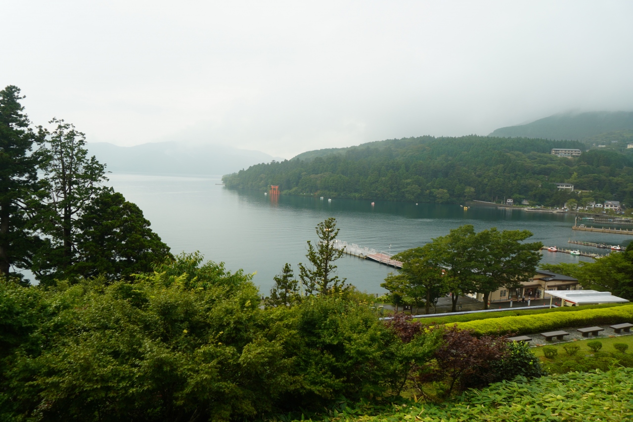 芦ノ湖から富士山を仰ぐ景色の中にぽつんとアクセントになっている赤い鳥居は、昭和27年、平成天皇の立太子礼とサンフランシスコ講和条約の締結を記念して建てられた水中鳥居で、平和の鳥居と呼ばれています。テレビとかでもこの鳥居が映ると芦ノ湖だなと分かるくらいシンボル的存在です。芦ノ湖の沿岸を走る車の通りから目の前ですが、この日は成川美術館の展望室から眺めました。