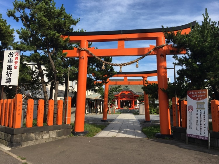 津軽海峡を背にしている神社。函館の街の成り立ちから見て、東側の海岸線へ分岐する要のポジションにあります。国道278線・漁火国道は函館駅を起点とし、この神社に突き当たって左折していきます。函館山から夜景を観察すると、このあたりでのクルマのライト・ブレーキランプが見事に絶景に取り込まれています。