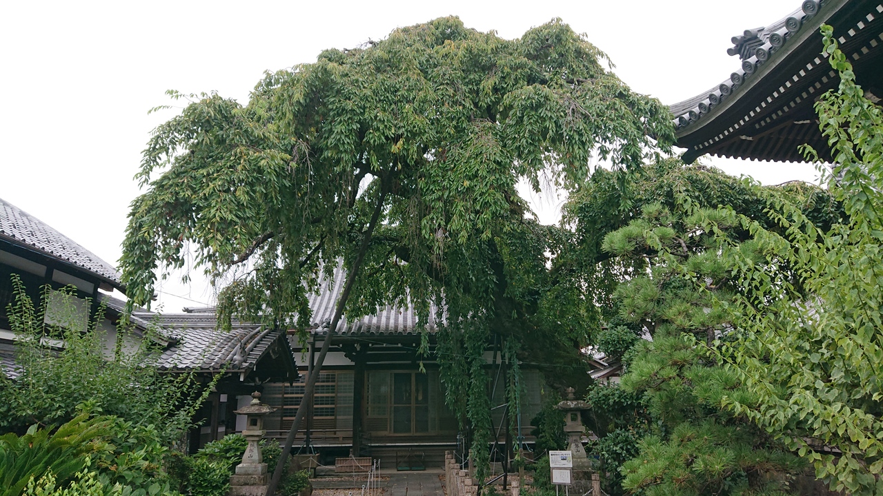 訪問して最も印象に残ったのは、境内のシダレザクラです。訪問したのが、8月中旬でしたので、当然花は咲いていませんでした。しかし、葉が青々としている様子が見られ、そして、それはそれで趣があり、立派な木だな、と感じました。