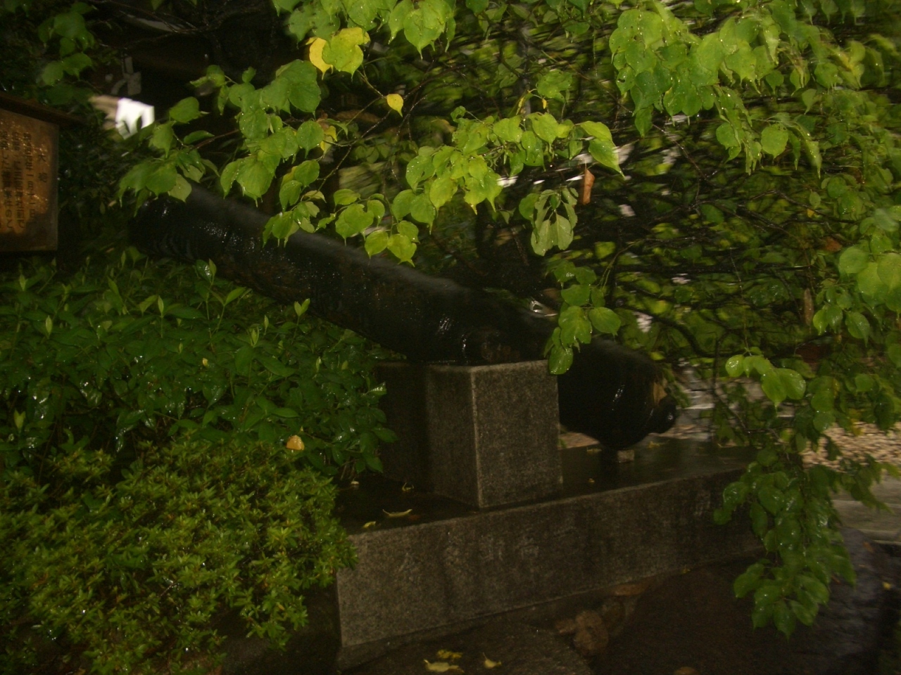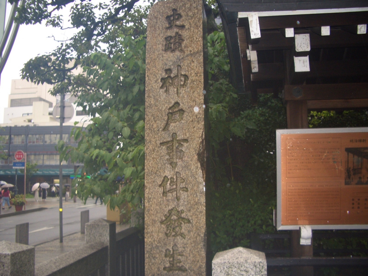 神戸事件発祥の地碑は、JR三宮駅から徒歩5分のところに鎮座している三宮神社の境内にあります。当時の大砲も展示されていました。神戸事件は1868年1月11日に三宮神社前に置いて備前藩兵が隊列を横切ったフランス人水兵らを負傷させ、銃撃戦に発展し、居留予定地をお検分中の欧米諸国公使らに水平射撃を加えた事件で、明治政府最初の外交問題となったものとのことです。