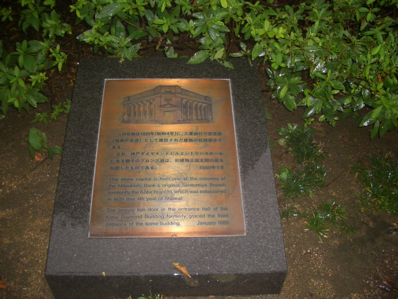旧三菱銀行三宮支店柱頭は、神戸大丸から少し東に行ったところにありました。大きな石に花が彫刻されたものです。説明書きのプレートと共にありました。説明書きがないと何か分かりませんでした。このものは、1929年(昭和4年)に建造された三菱銀行三宮支店の建物の柱頭とのことです。尚、神戸支店のある神戸ダイヤモンドビルのエントランスホールの壁に埋め込まれている獅子のブロンズ扉は、三宮支店の正面玄関の扉とのことです。興味がある方は、両方を探されては如何でしょうか。