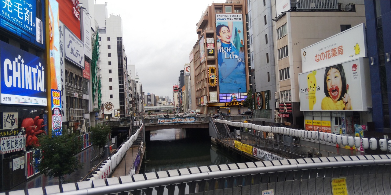 道頓堀川は大阪・ミナミを流れる、あまり大きくはない川です。テレビのインタビューなどでよくみかける戎橋や団体バスの乗降場所のある日本橋や道頓堀橋などもこの川にかかっています。8月中旬にいきましたが、まだ天神祭の提灯が残されていました。