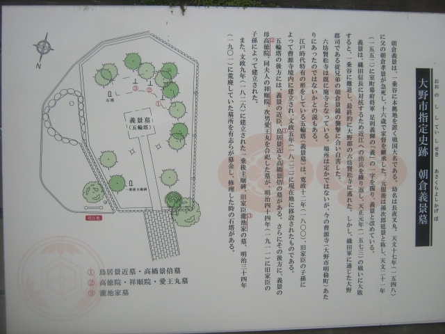 朝倉義景墓所は、日本名水百選の一つとしても名高い御清水(おしょうず)の南側にあります。織田信長との戦いに敗れた義景は、大野で自害したそうで、墓所としてはそれ程大きくはないのですが、付近が義景公園として整備されていますので、歴史浪漫に浸って過ごすのにはとても良い場所だと思います。